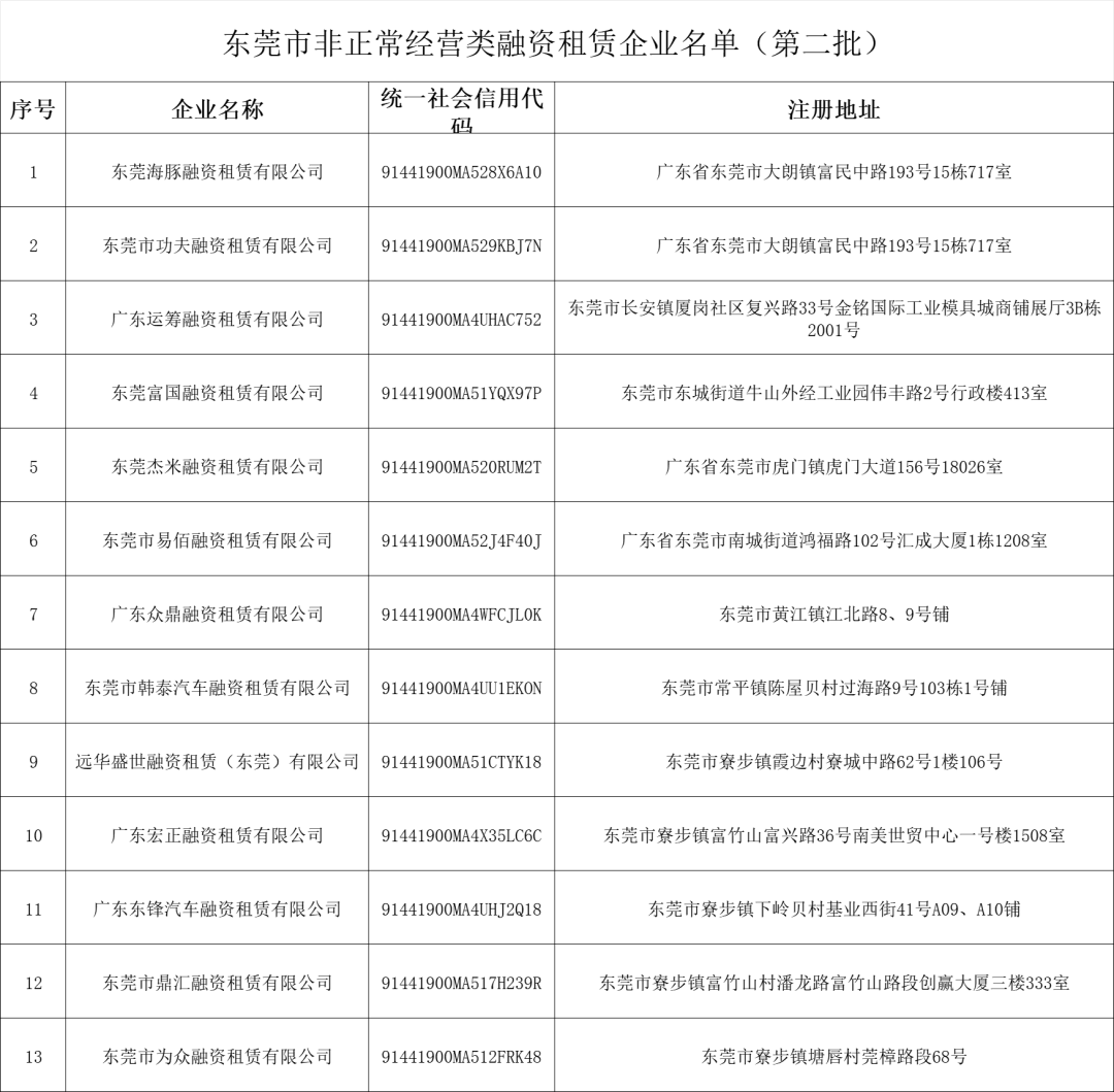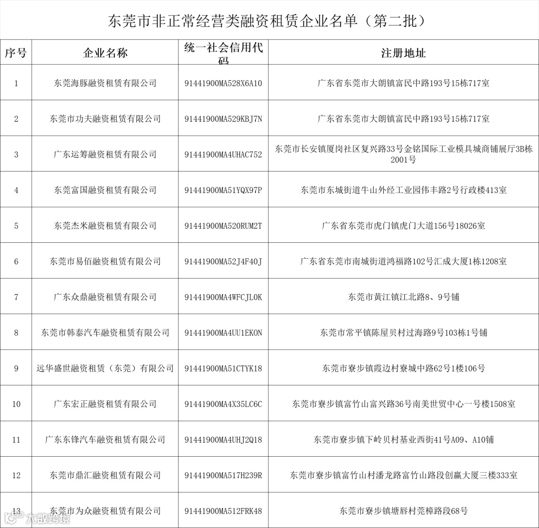 13家,东莞市发布第二批非正常经营类融资租赁名单