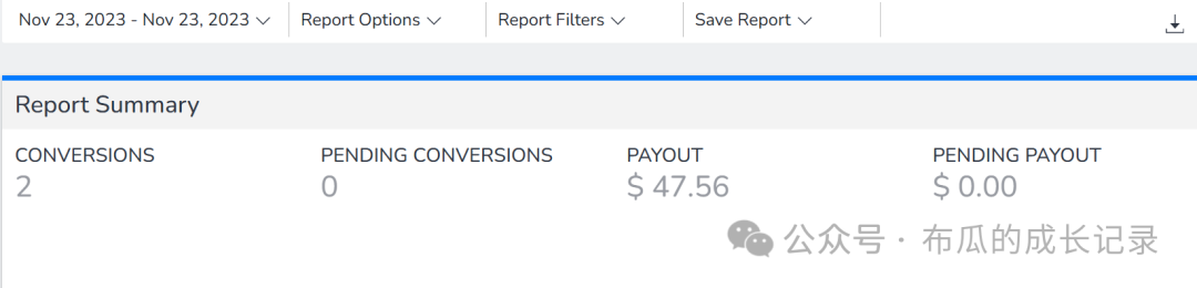 网站日均访问量突破了100,11.23日,我收到了人生第一笔联盟佣金47.56美元。