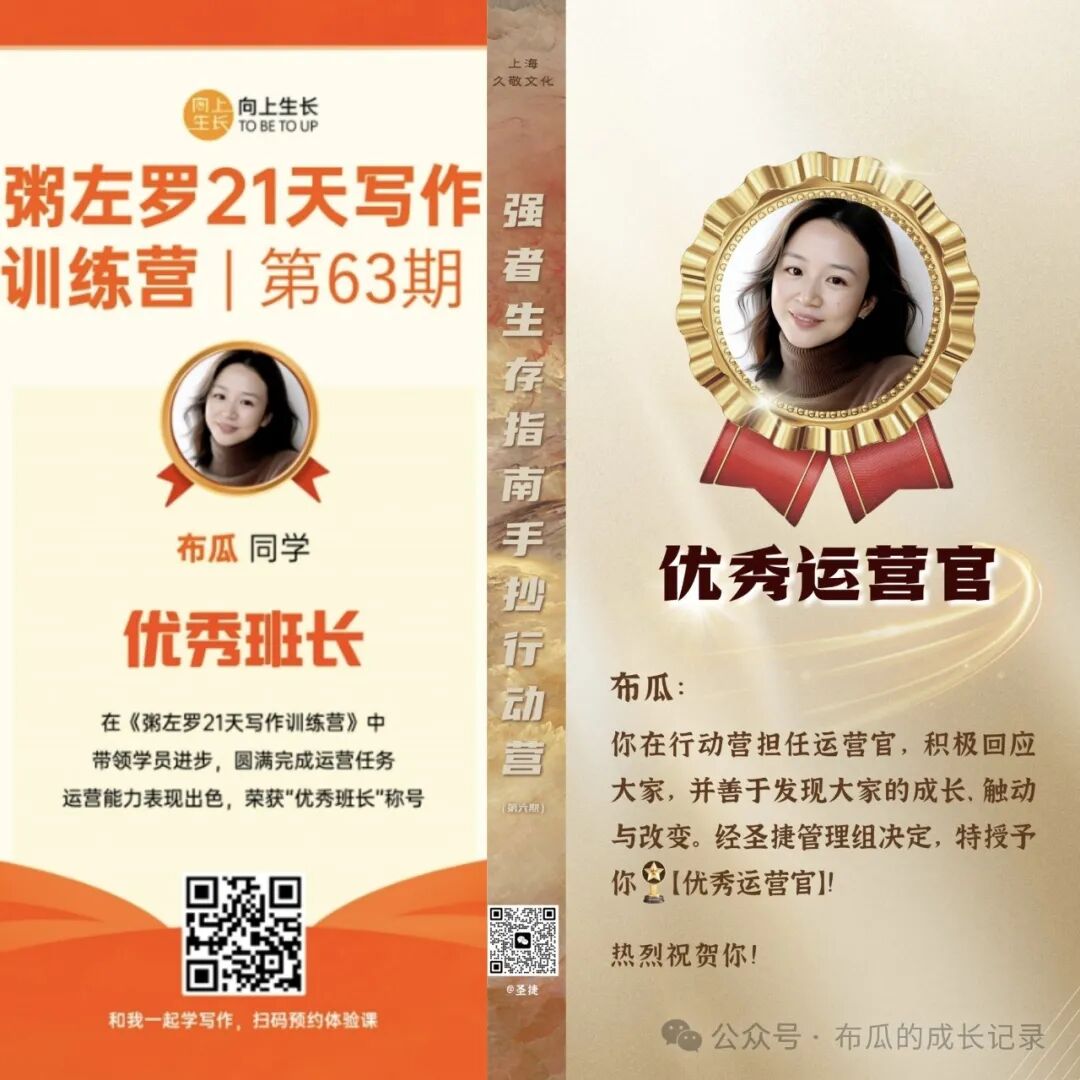 同时,为了提升自己运营能力,2月和3月我分别报名参加了粥老师21天写作训练营的班长和圣捷老师7天手抄行动营的组长,结营时,意外地分别获得了优秀班长和优秀运营官的称号。