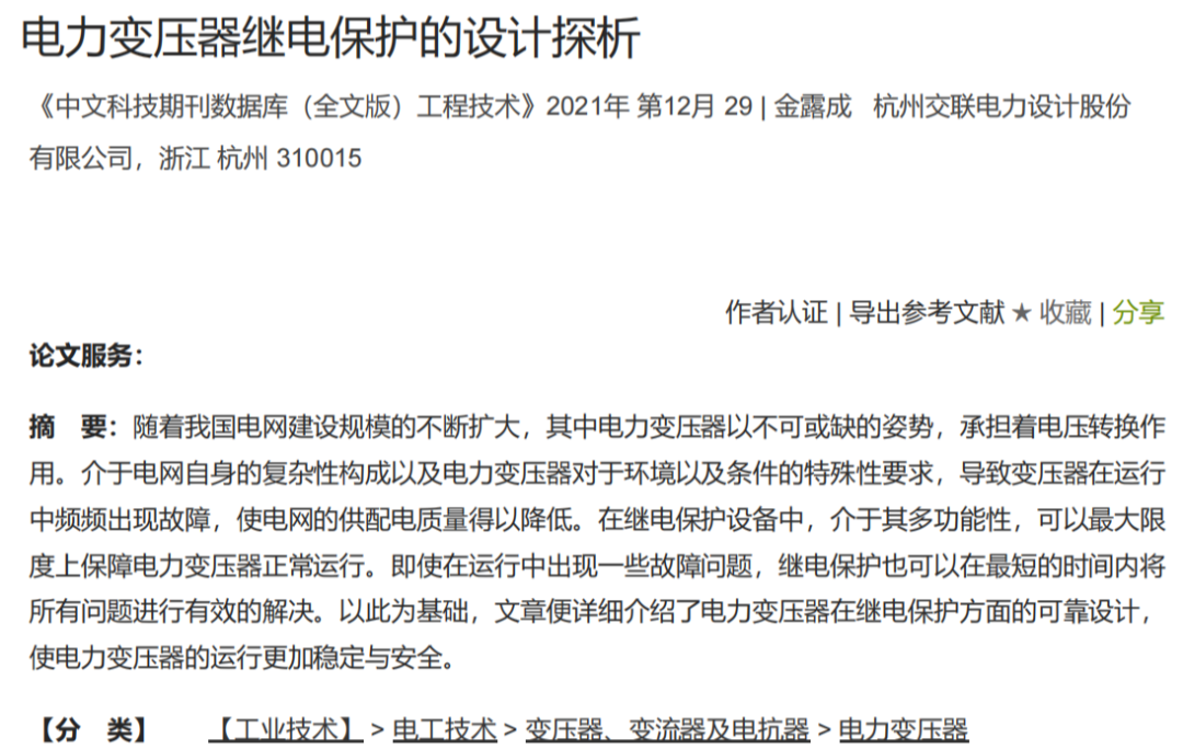 此外,金露成还想把自己的技术经验传播向社会,已多次在期刊上发表文章。《中文科技期刊数据库(全文版)工程技术》2021年第12月29期就收录了他的《电力变压器继电保护的设计探析》研究文章。