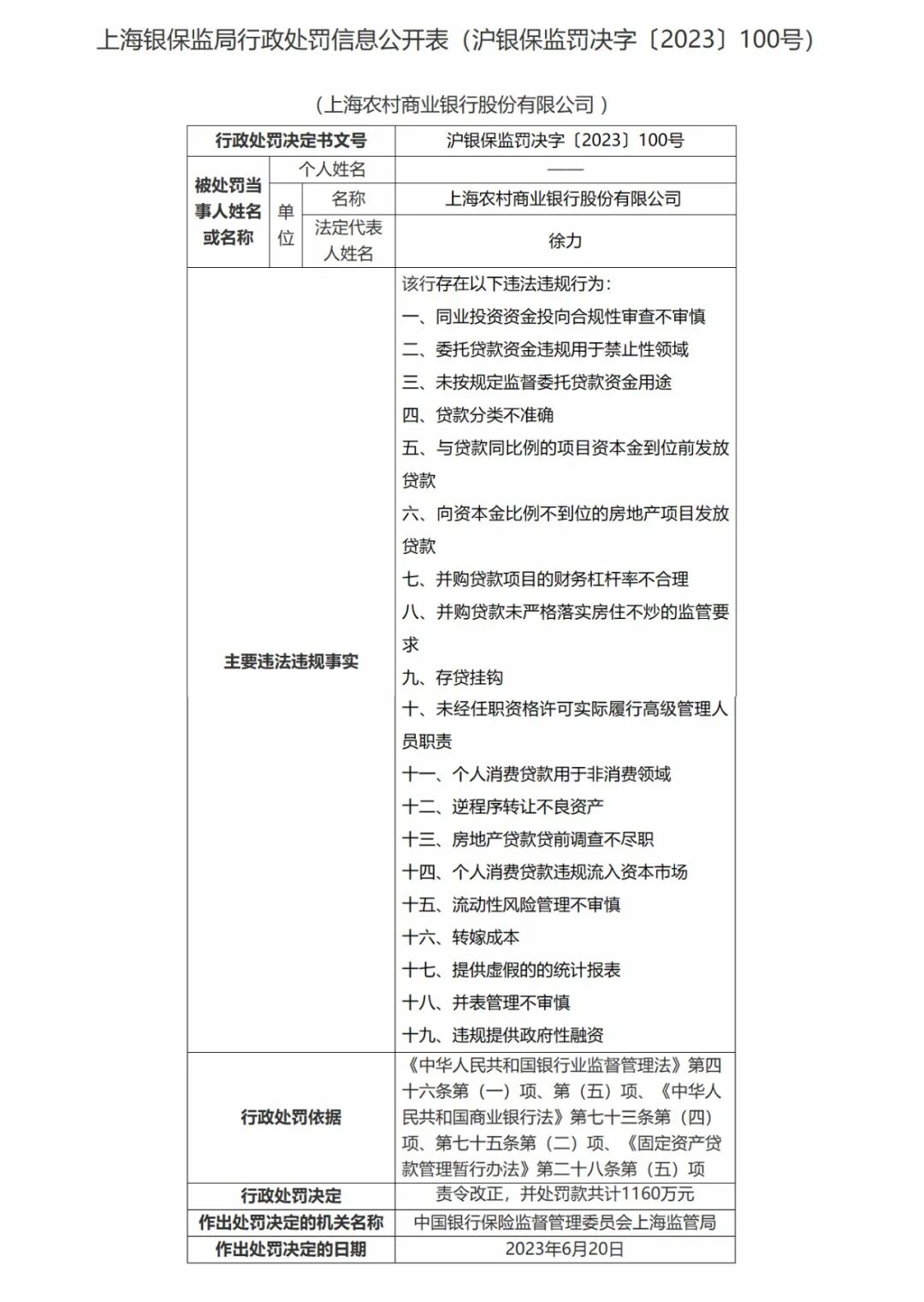 因上述违法违规事实,上海农商行被监管责令改正,并处罚款共计1160万元。