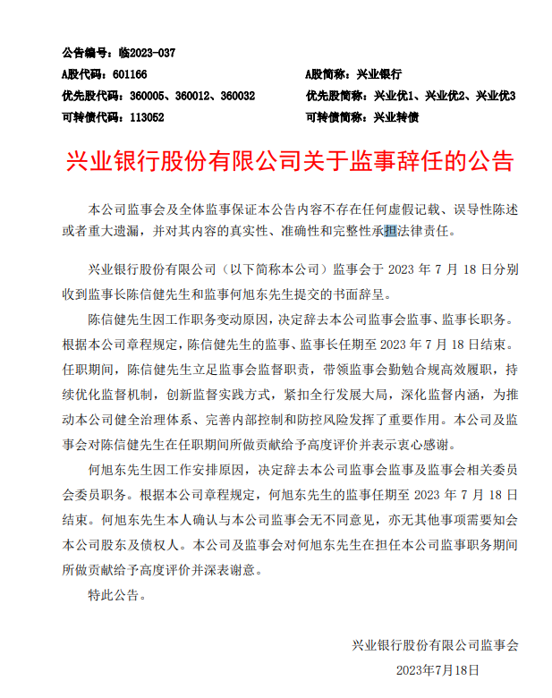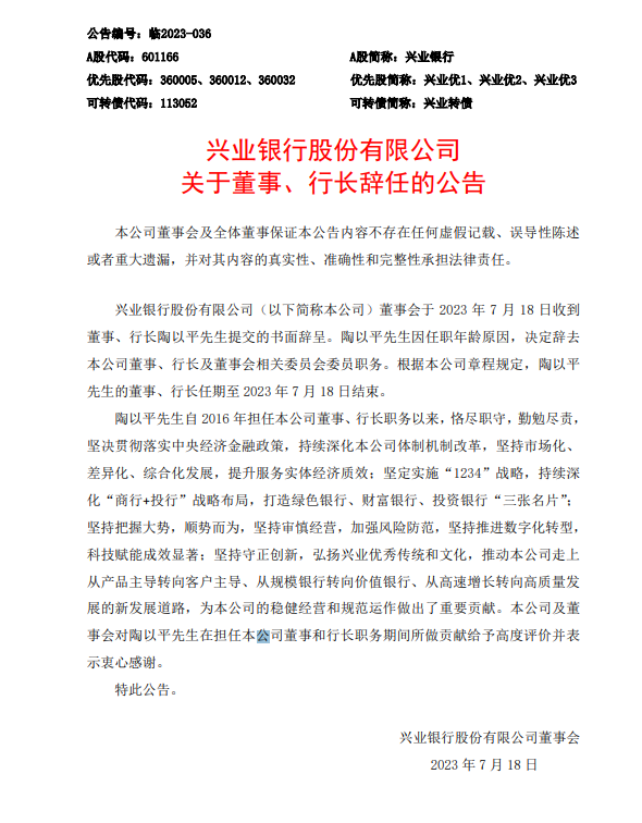 7月18日晚间,兴业银行公告称,该公司董事会于2023年7月18日收到董事、行长陶以平先生提交的书面辞呈。陶以平先生因任职年龄原因,决定辞去该公司董事、行长及董事会相关委员会委员职务。根据公司章程规定,陶以平的董事、行长任期至2023年7月18日结束。