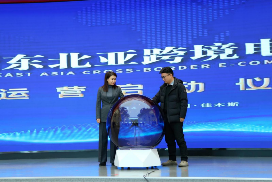 区委书记郝旺和必创集团执行总裁刘征共同触摸启动球,佳木斯东北亚跨境电商产业园宣告正式运营。