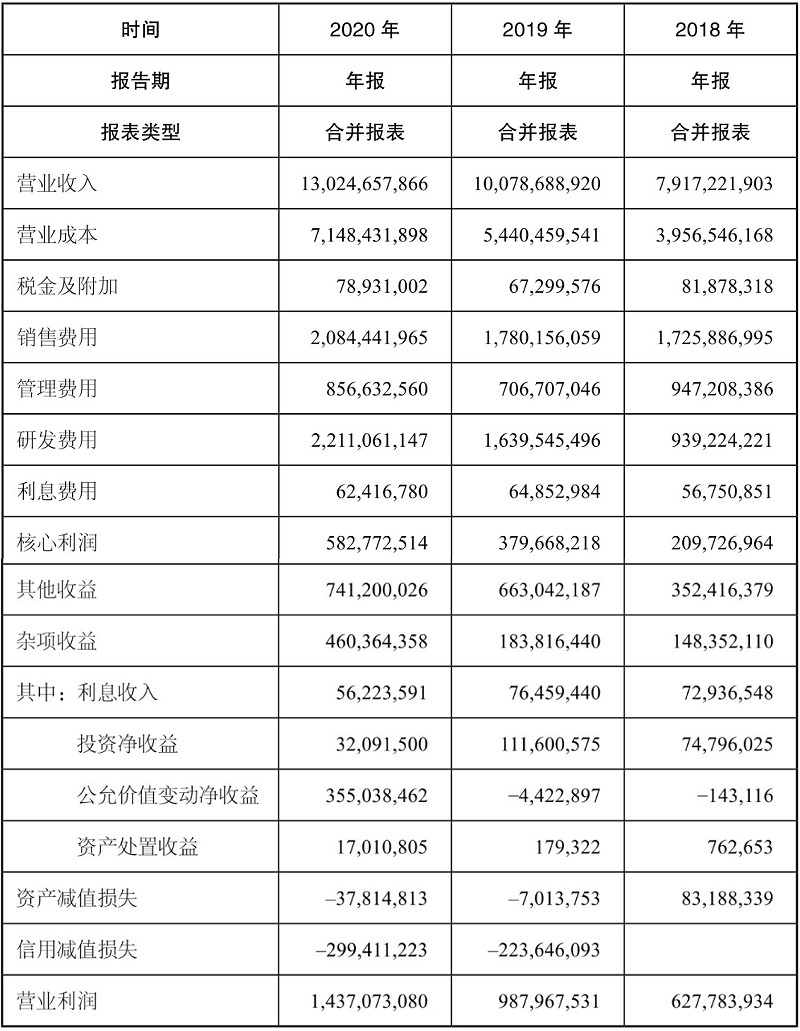 从科大讯飞2018年至2020年合并利润表的数据可以看到,科大讯飞的营业收入成长性相当不错——2018年为79亿元,2019年为101亿元,2020年为130亿元;营业利润的成长性也是不错的——2018年为6.28亿元,2019年为9.88亿元,2020年为14.37亿元。更重要的是,企业营业利润的增长速度显著高于营业收入的增长速度。