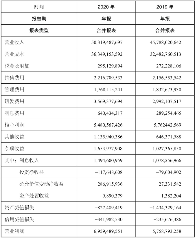 从表中可以看出:在2019年至2020年间,企业的营业利润成长态势明显。企业的核心利润牢牢占据营业利润的主体,为支撑企业营业利润的第一大主力;补贴收益占营业利润的比重并不大,支撑企业杂项收益的主力军是利息收入,其他杂项收益并不多。企业聚焦主业、主业具有较强盈利能力的色彩是比较明显的。