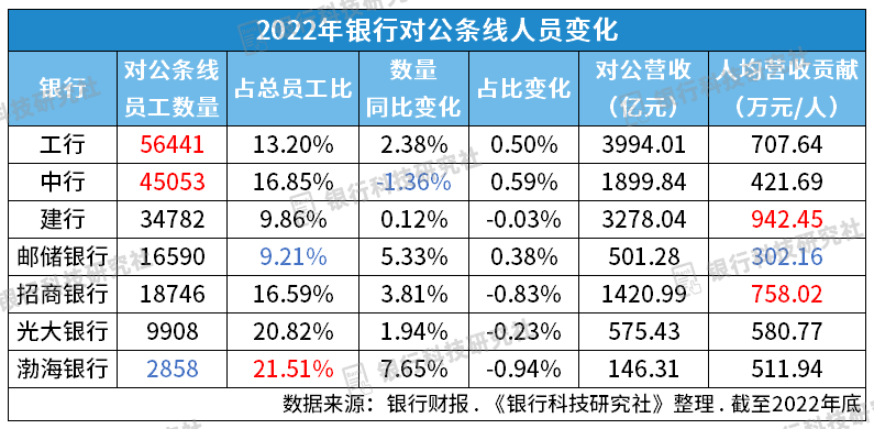 本篇对比了国有银行、股份制银行2022年科技人员、对公条线业务人员的变化,并对比各家相应人员的营收贡献,基于此对比各家银行的人才现状。