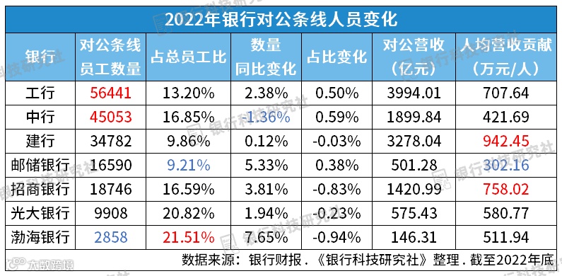 与2022年各家科技人员占比整体上增长、唯二下滑的招行和浦发是轻微下滑相比,在对公条线员工占比上,各银行的“默契”不高,占比增长、下滑的银行几乎对半分。在对公条线的人员布设上,各银行的选择个性化明显,对公条线员工占比波动也很明显。
