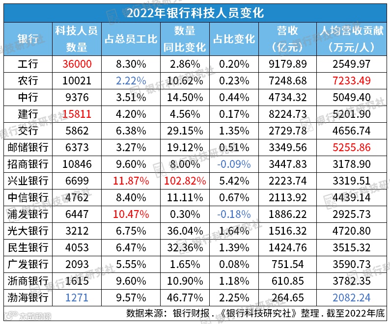 据《银行科技研究社》整理(中行营收、科技人员的统计维度均为内地商业银行,平安、华夏、恒丰银行未披露相关数据),除招行、浦发银行科技人员占比略下滑之外,其余各家银行2022年科技人员数量、占比均增长。