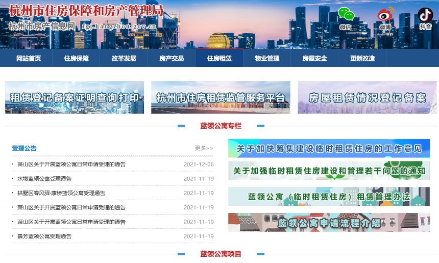 登录杭州市住房保障和房产管理局官网选择“住房租赁”模块;(http://fgj.hangzhou.gov.cn/)