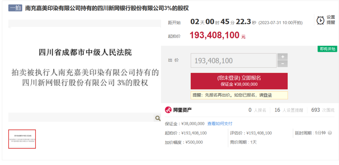 阿里拍卖网站显示,新网银行3%的股权将于7月31日上午10点开始进行第一次司法拍卖,起拍价1.93亿元。截至30日中午11时45分,此次拍卖已有16人设置提醒以及728次围观。