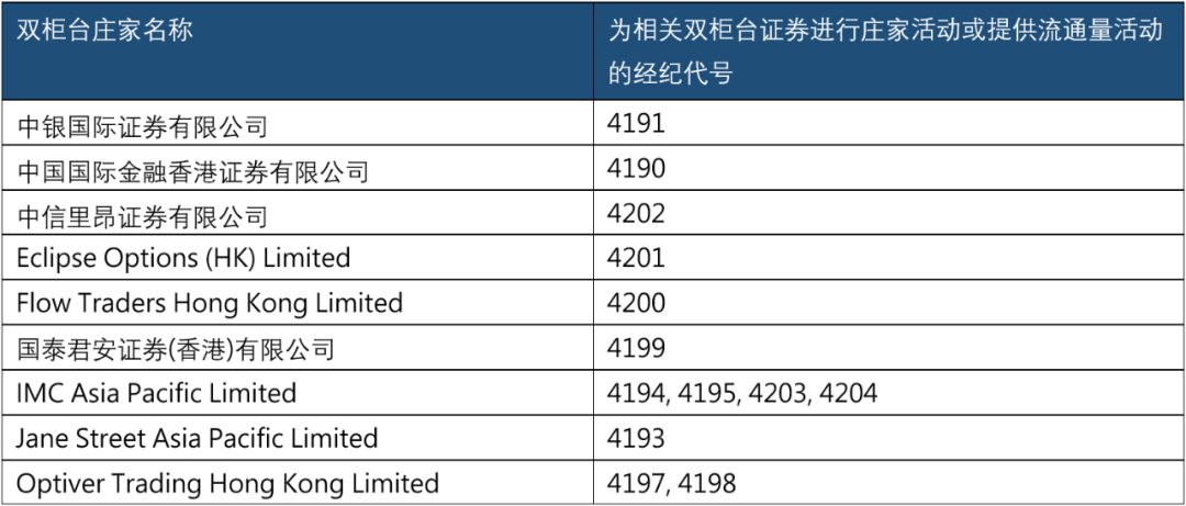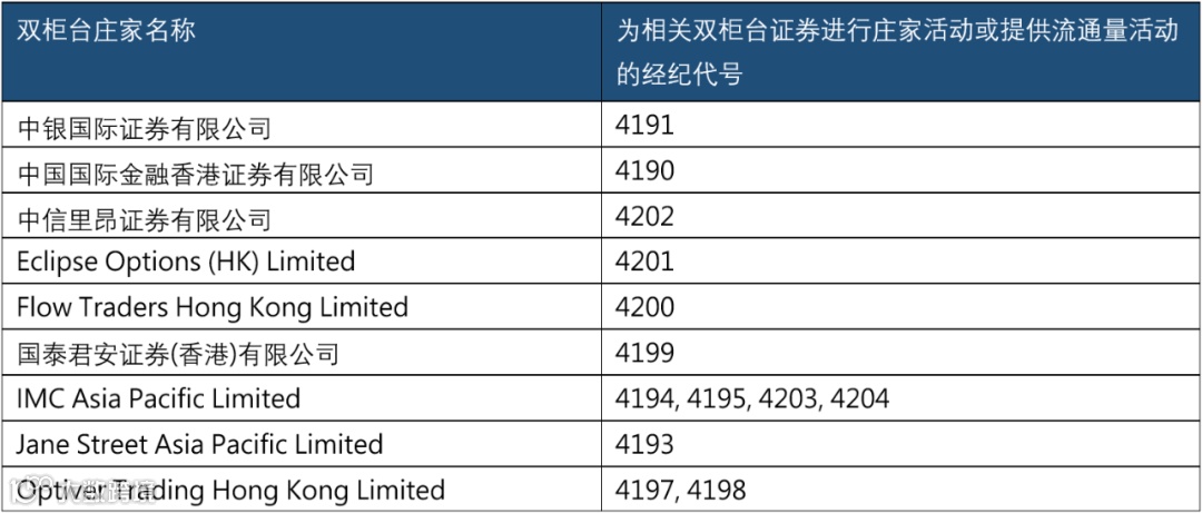 香港交易所还披露,以下9个交易所参与者已获授双柜台庄家(“DCMM”)执照,可于双柜台模式推出后于相应的双柜台证券进行庄家活动或提供流通量活动。