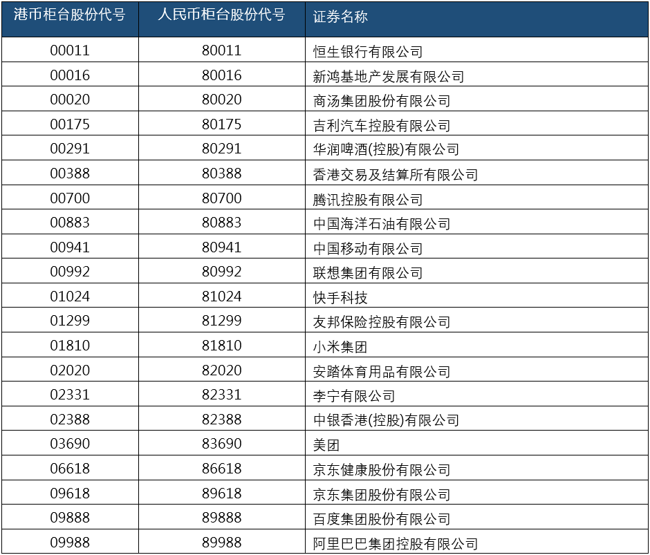 其中包括恒生银行、新鸿基地产、商汤-W、吉利汽车、华润啤酒、香港交易所、腾讯控股、中国海洋石油、中国移动、联想集团、快手-W、友邦保险、小米集团-W、安踏体育、李宁、中银香港、美团-W、京东健康、京东集团-SW、百度集团-SW、阿里巴巴-SW、比亚迪、中国平安和长城汽车。