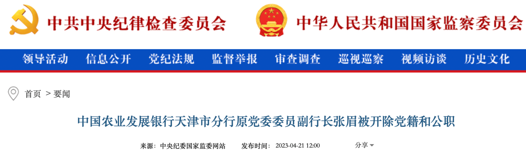 4月21日,中央纪委国家监委网站显示,中国农业发展银行天津市分行原党委委员副行长张眉被开除党籍和公职,上海证券交易所原副总经理刘逖接受监察调查。
