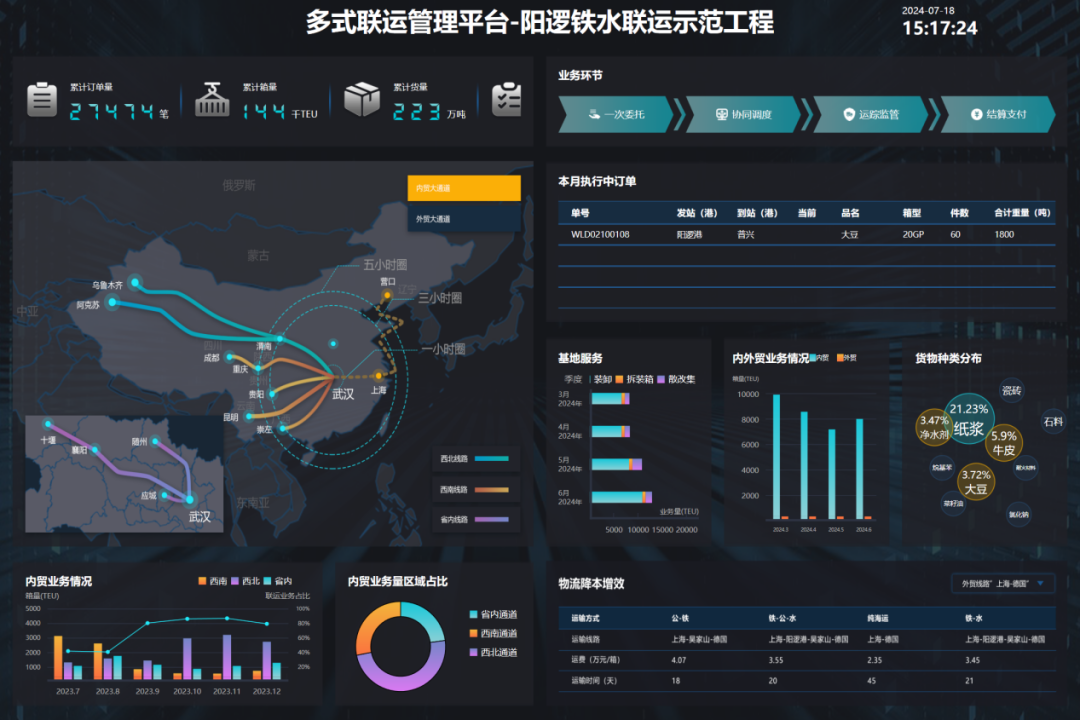 平台试运行以来,积极推进供应链物流数据资源体系建设并挖掘数据应用场景,已取得初步成效。一是数据协同助力多式联运降本增效,已完成物流协同交易额42.9亿元,实现47条多式联运品牌线路精益化运营。二是数据复用拓宽融资新渠道,为企业打通纯数据信用融资渠道。三是数据融合创新推动政企协同,已开通武汉长江中游航运中心9条航运航线补贴线上申报。四是数据赋能支撑产业发展,以物流、金融、政策服务支撑区域特色产业,建成上线荆门、房县、郧阳、南漳4个区域平台。