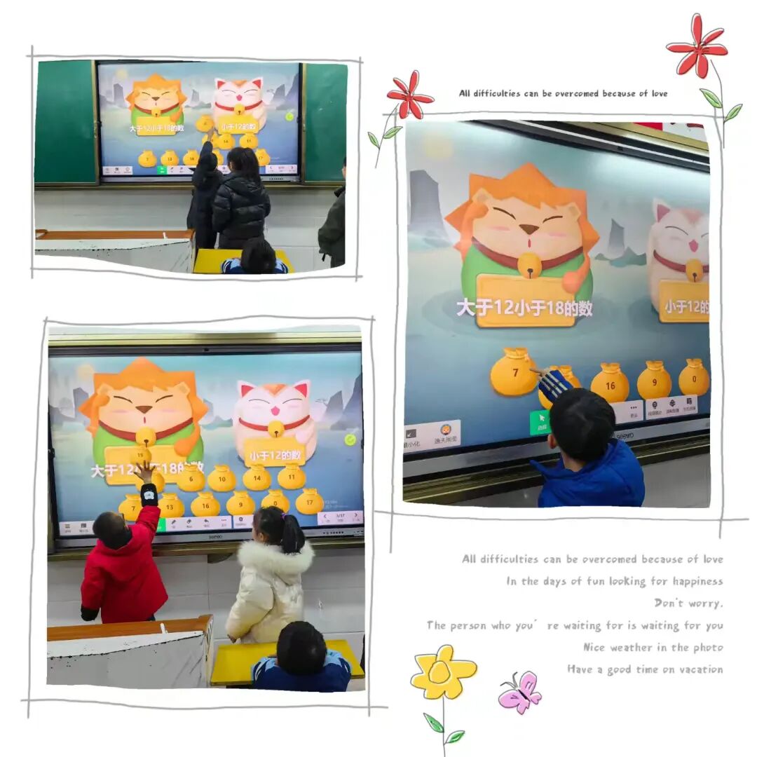 比大小是数的概念中最基础的知识之一,是学习数学的开始,也是进一步学习后面数学最重要的基础。学生分别将写着“大于12小于18 的数”和“小于12的数”的福袋放到“福猫”和“招财猫”的怀里,充满童趣,同时加深了对数字大小关系的理解。