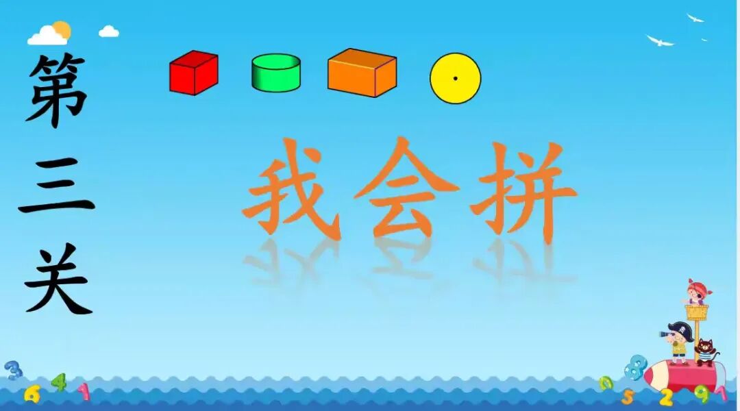 通过拼一拼,考察学生对常见的立体图形的辨认情况,特别是长方体和正方体的区别、圆柱和球的特征的把握。