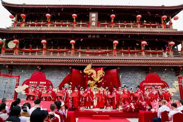 在广东省潮州镇海楼前,一场公益集体婚礼浪漫举行。在千年古城和公益福彩的见证下,11对新人携手踏上红毯,共同宣读婚书,开启幸福人生新篇章。婚礼融合了中华传统文化和福彩公益文化,向新人传递了美好祝福。