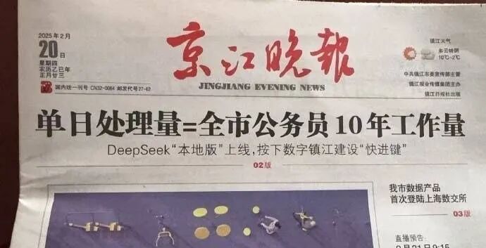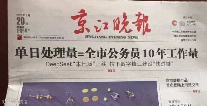 2月19日,江苏镇江宣布DeepSeek正式登陆并完成本地化部署上线。