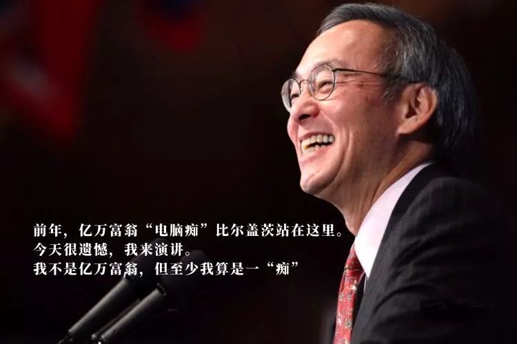 去年登上这个讲台的是,英国亿万身家的小说家J.K罗琳女士,她最早是一个古典文学的学生。前年站在这里的是比尔·盖茨先生,他是一个超级富翁、一个慈善家和“电脑痴”(computer nerd)。今年很遗憾,你们的演讲人是我,虽然我不是很有钱,但是至少我是一个“书呆子“(nerd)。