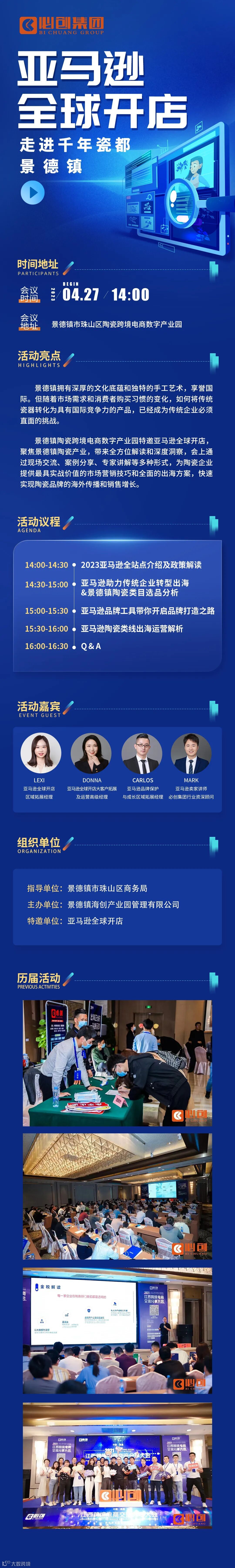 为持续推进跨境电子商务产业高质量发展,搭建交流平台,帮助本地传统企业数字化转型和品牌出海,亚马逊全球开店景德镇、蚌埠站活动将于2023年4月27日分别在景德镇陶瓷跨境电商产业园和蚌埠南山豪生大酒店举行。