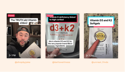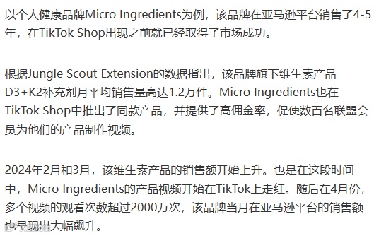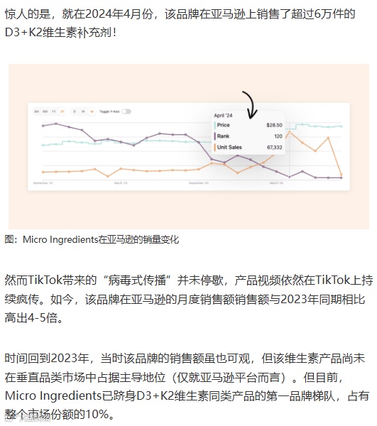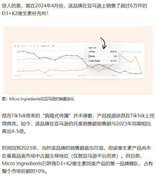 图:Micro Ingredients在TikTok的推广视频截图;该品牌过去两年在亚马逊的单位销售额变化(橙色曲线)