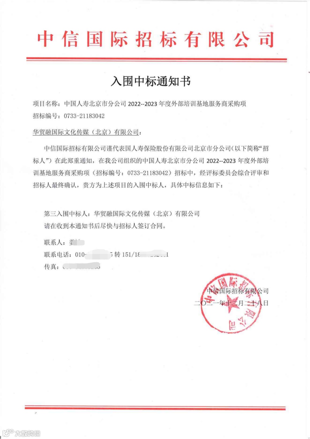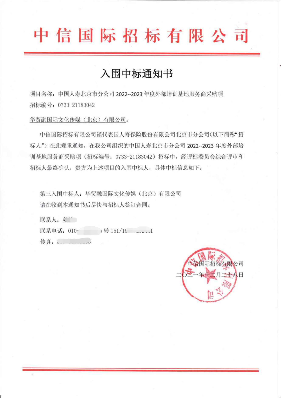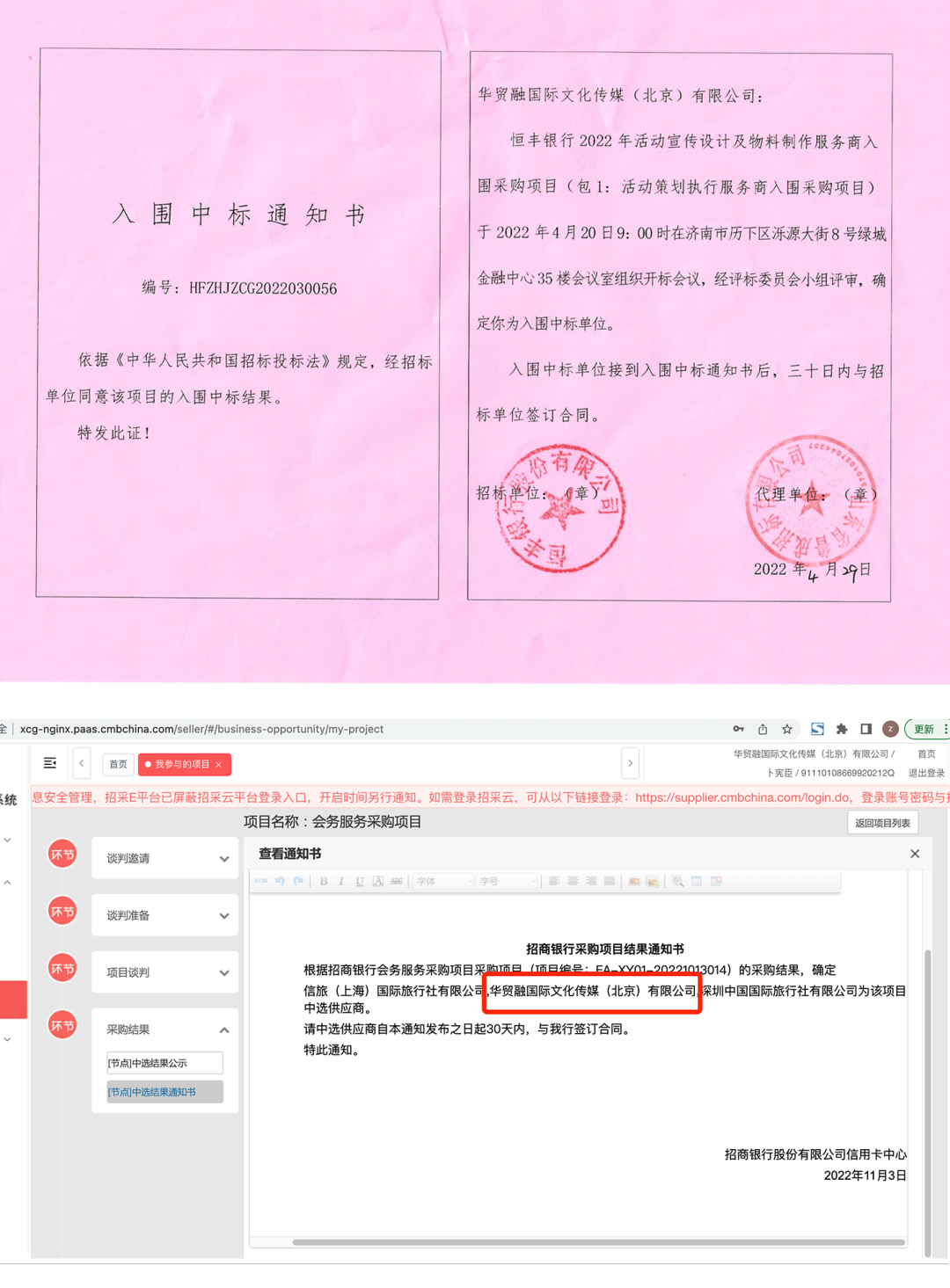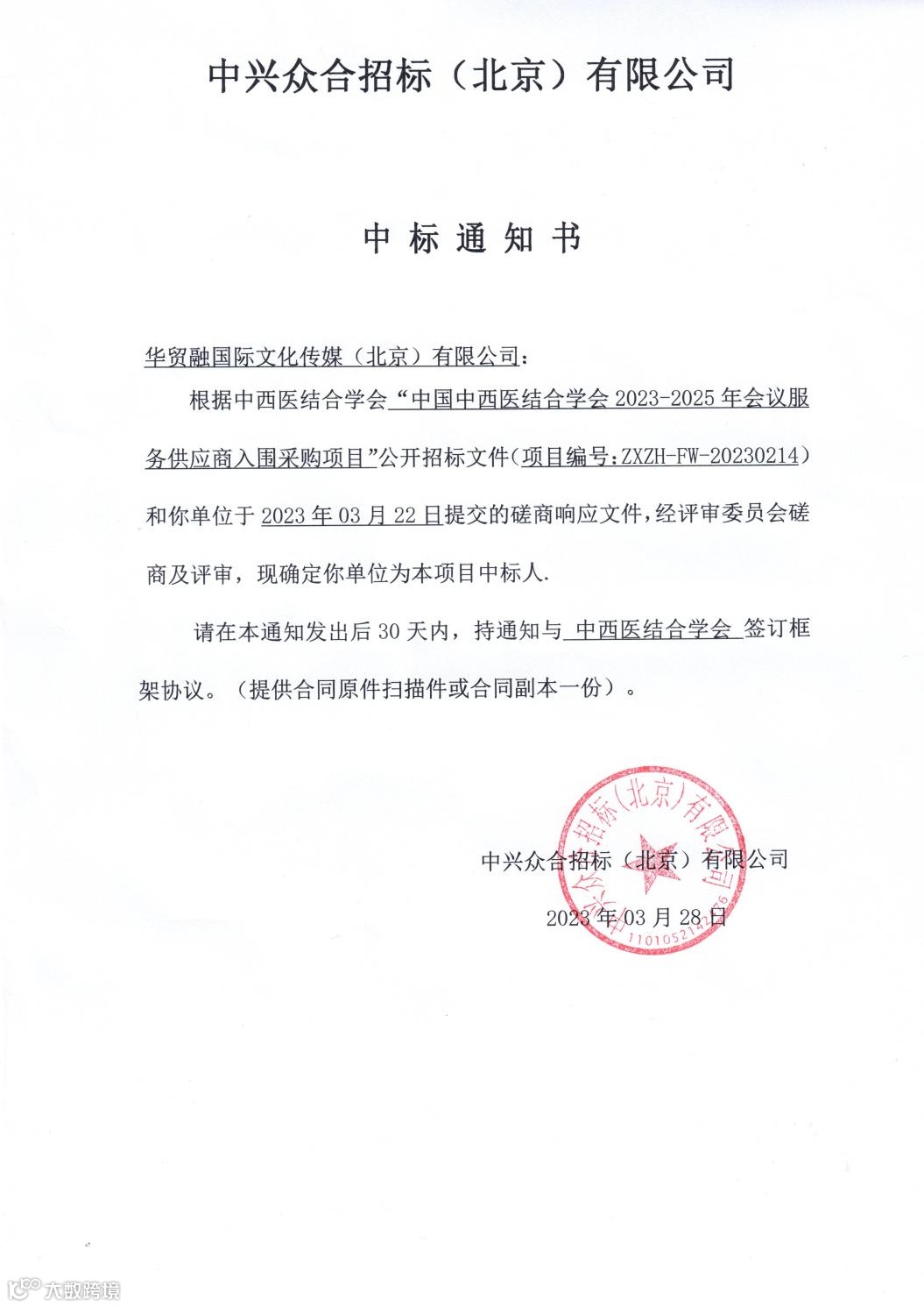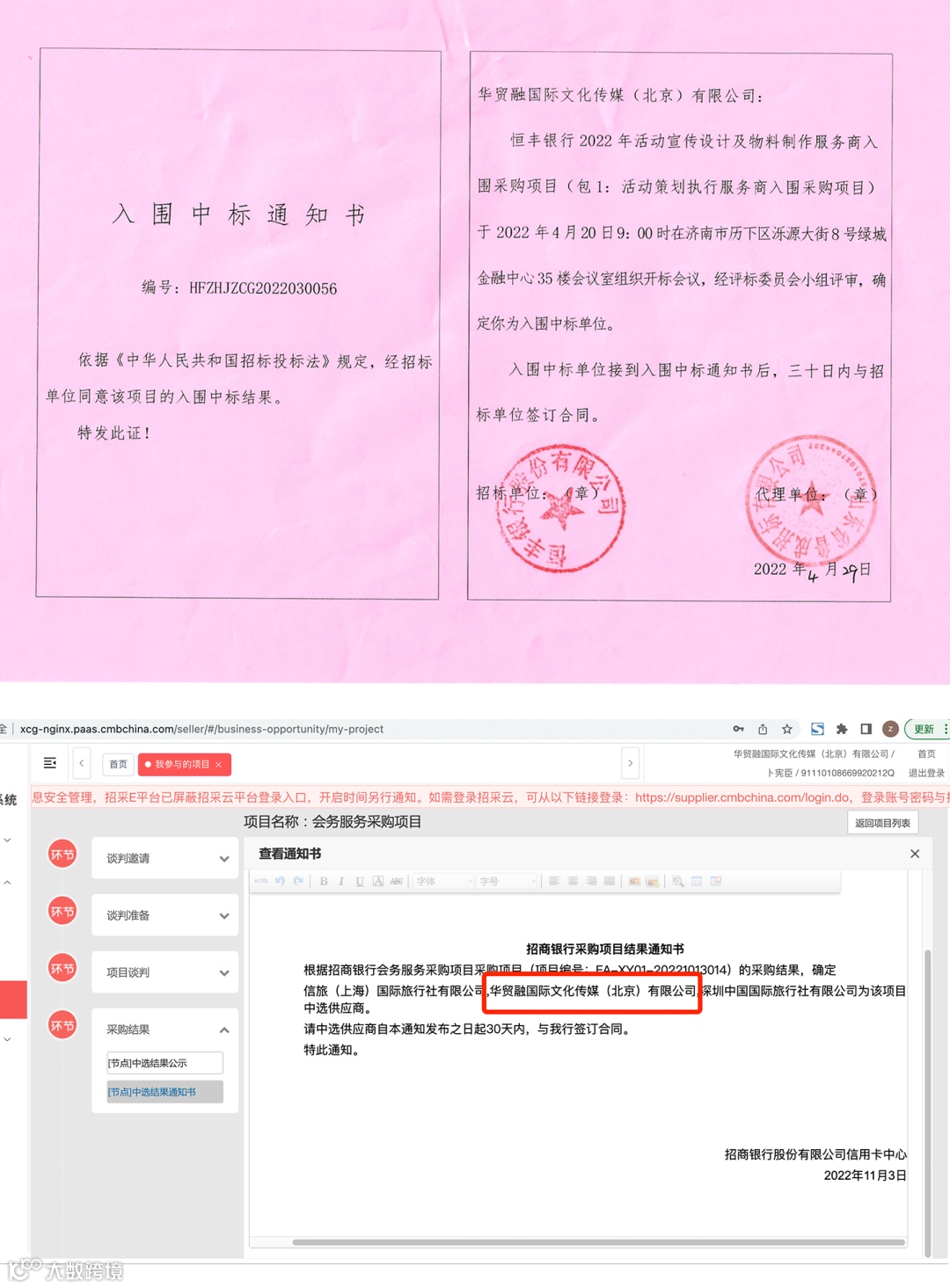 近一年来,在【中国医院协会2023-2025年度会务服务供应商入围项目】、【财通证券股份有限公司2022-2024年补充会务服务公司入围采购项目】、【中国中西医结合学会2023-2025年会议服务供应商入围采购项目】、【招商银行信用卡中心集中采购项目】、【2022年度北京市分公司销售支持工具、宣传设计及制作等入围供应商采购项目】、【恒丰银行2022年活动宣传设计及物料制作服务商入围采购项目(包1 活动策划执行服务商入围采购项目)】中凭借扎实高效的工作作风,良好的商业信誉,以绝对的优势顺利中标!