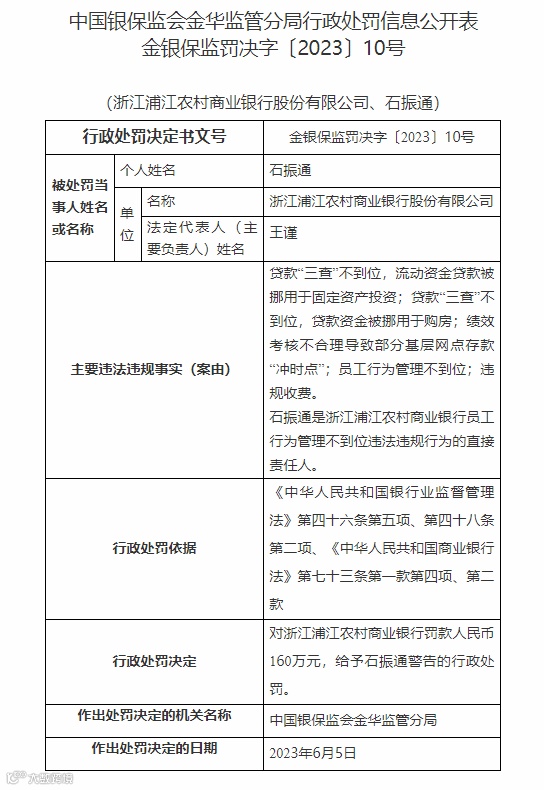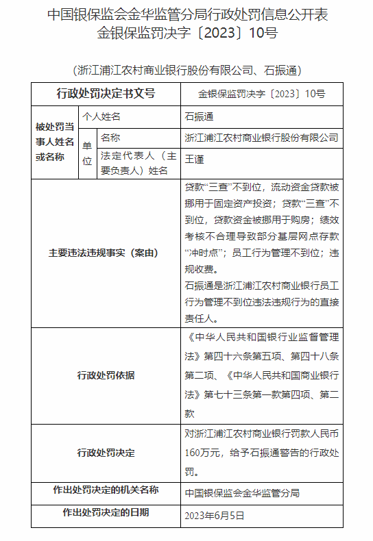 此外,石振通是浙江浦江农村商业银行员工行为管理不到位违法违规行为的直接责任人,被浙江监管局给予警告的行政处罚。