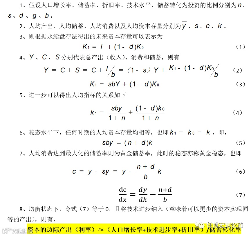 2、按照前面所讨论的,自然利率也可以被理解为经济稳态增长下资本的边际产出,从这个角度看,自然利率≈(人口增长率+技术进步率+折旧率)/储蓄转化率