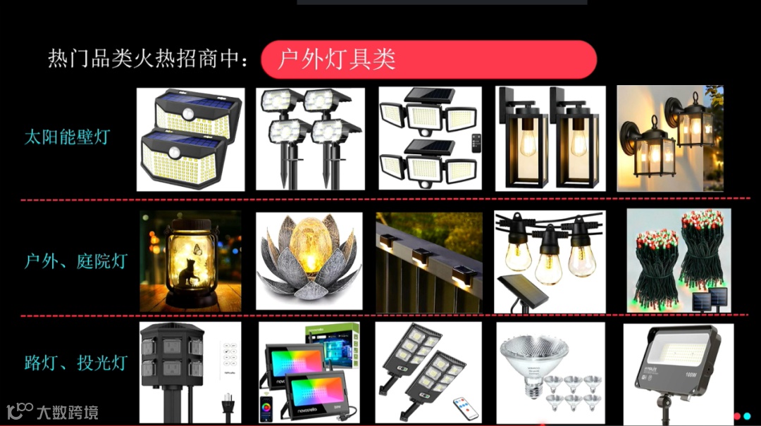 目前灯具在海外的适用性相对来说是比较强的,像户外照明、户外灯具有几个细分类目——太阳能壁灯、户外、庭院灯、路灯、投光灯、太阳能壁灯。