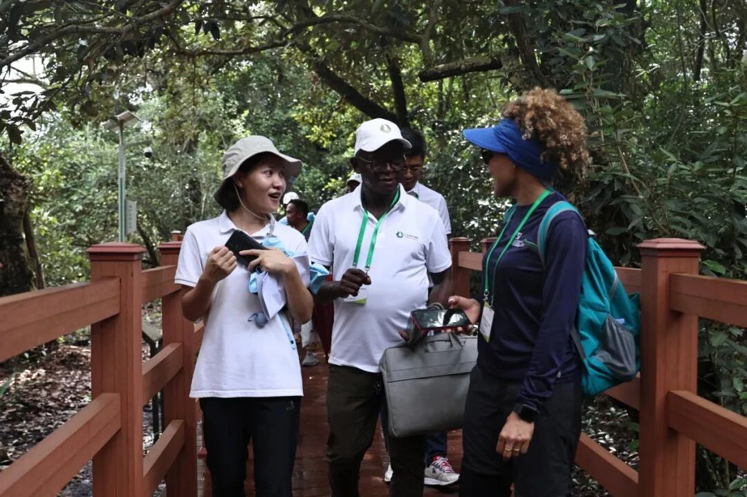 Ou Wei (L), vice principal of Baguang Nature School, exchanges ideas with visiting foreign environmental experts during a tour of the mangrove park in Baguang.