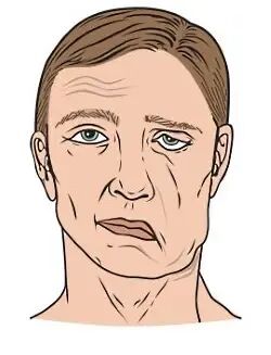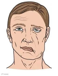 家人或者自己照镜子时出现插图这种半边脸瘫痪下垂(或者一侧肢体突然严重无力)的现象也是中风的症状,应该立即拨打急救电话求救!
