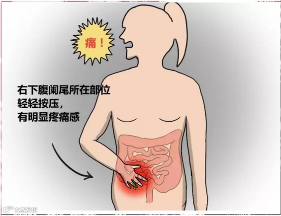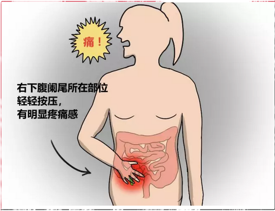 当出现腹部疼痛时,如果接着有食欲不振、恶心呕吐,数小时后疼痛感觉慢慢移至右下腹,用手按下弹起时痛楚加剧。