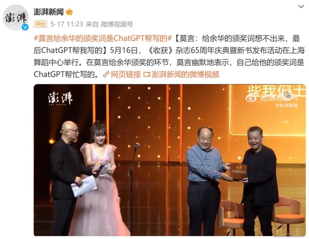 Chinese Nobel Prize winner Mo Yan had sought the assistance of ChatGPT for help to write a prize citation for another famous Chinese writer Yu Hua, Mo revealed during the 65th anniversary of the Chinese literary bimonthly magazine Shouhuo (Harvest) in Shanghai on Tuesday.