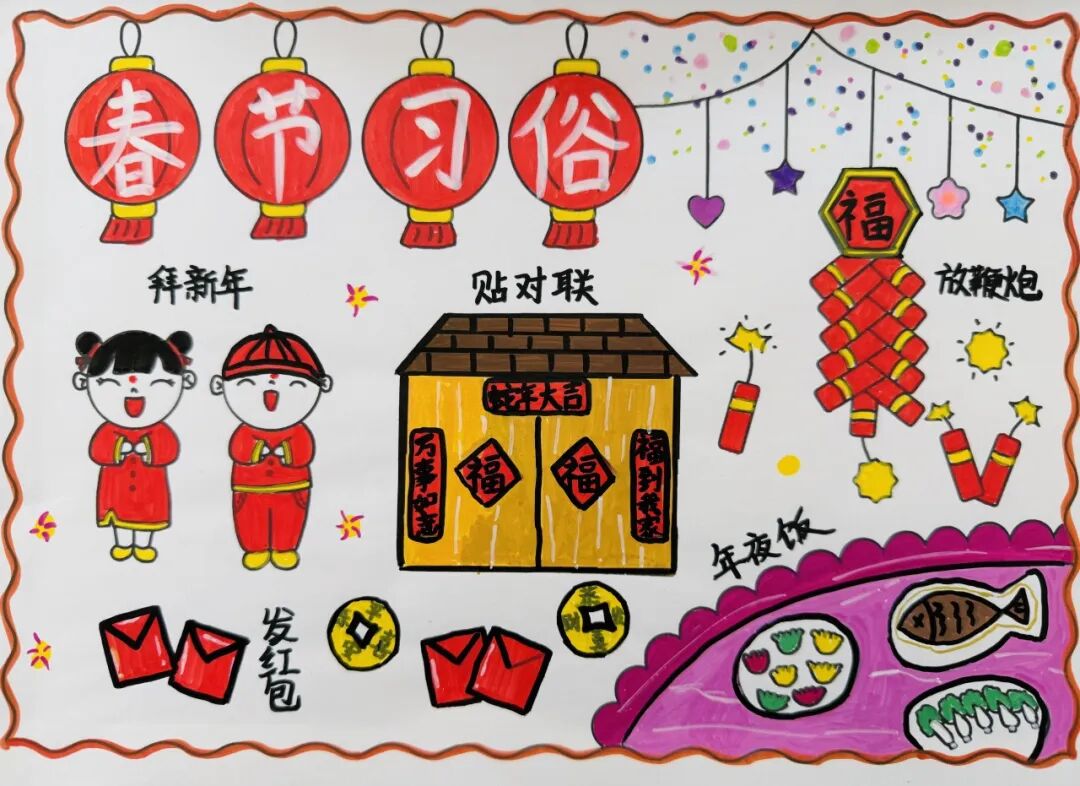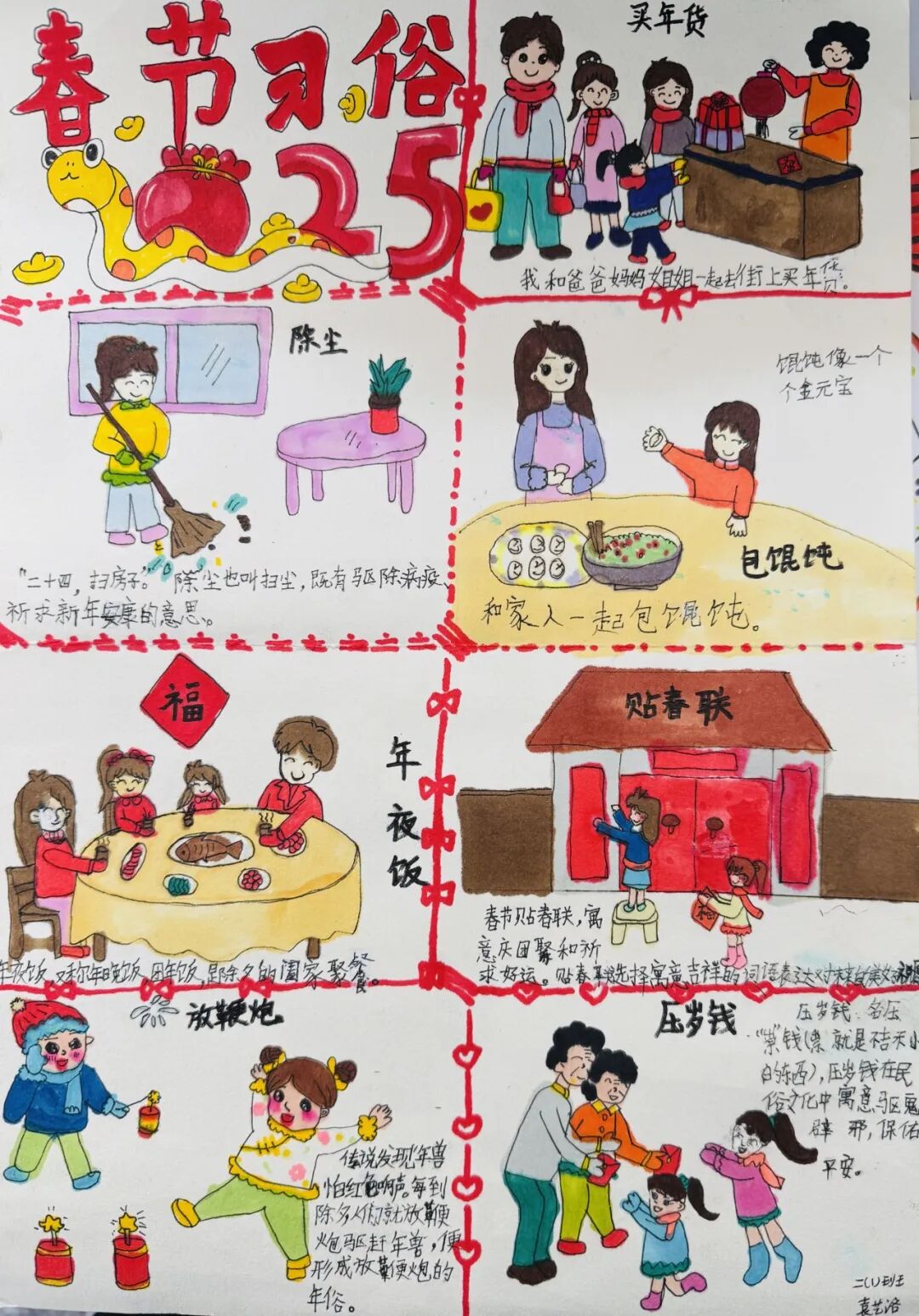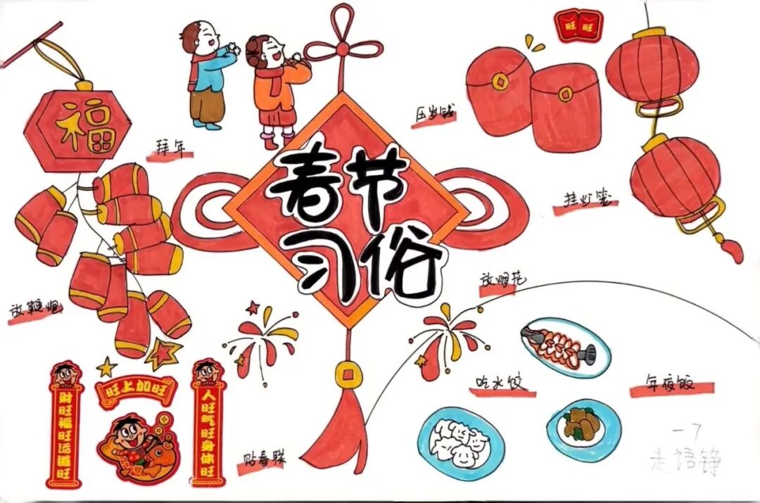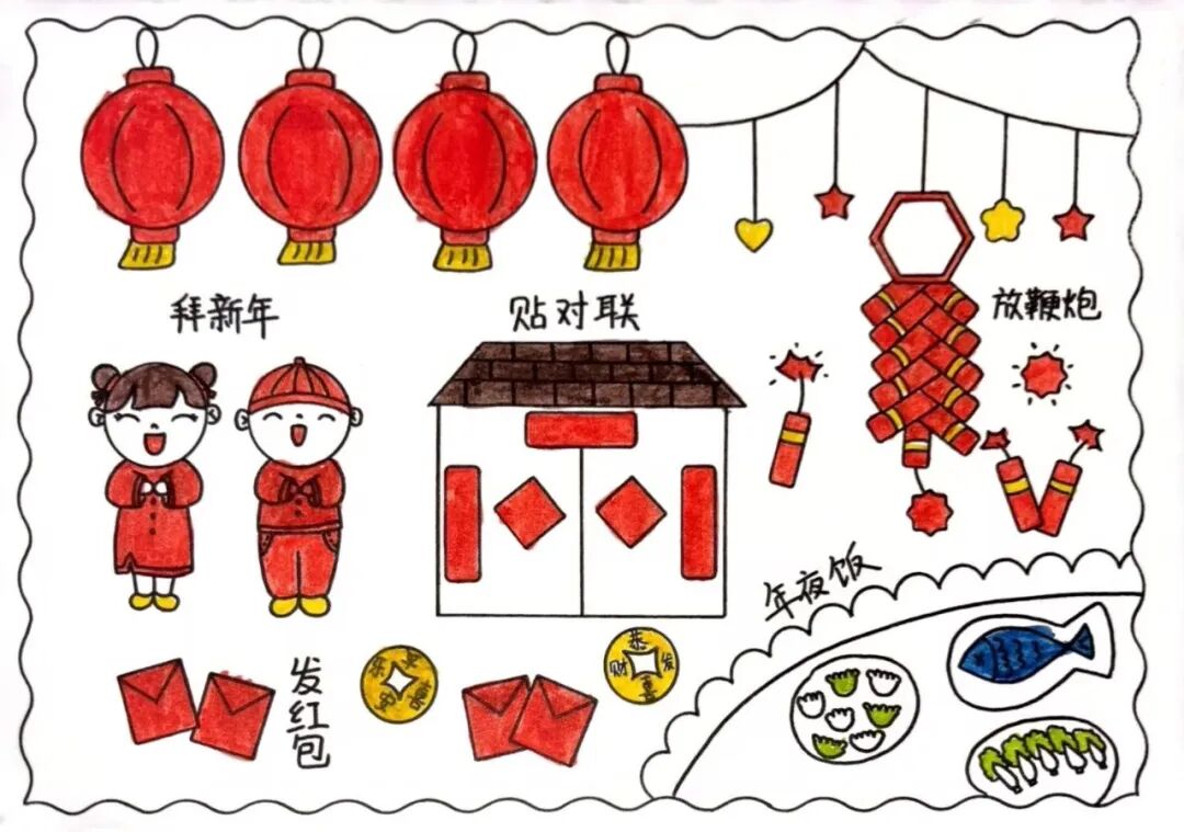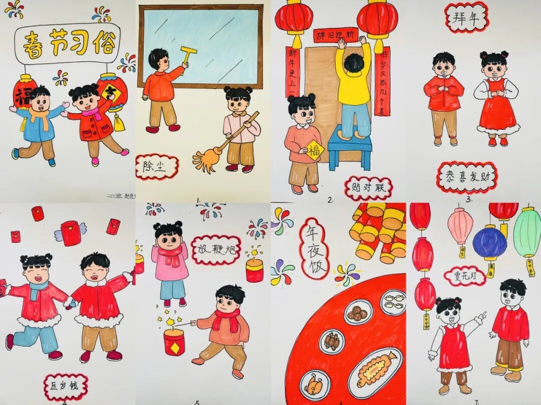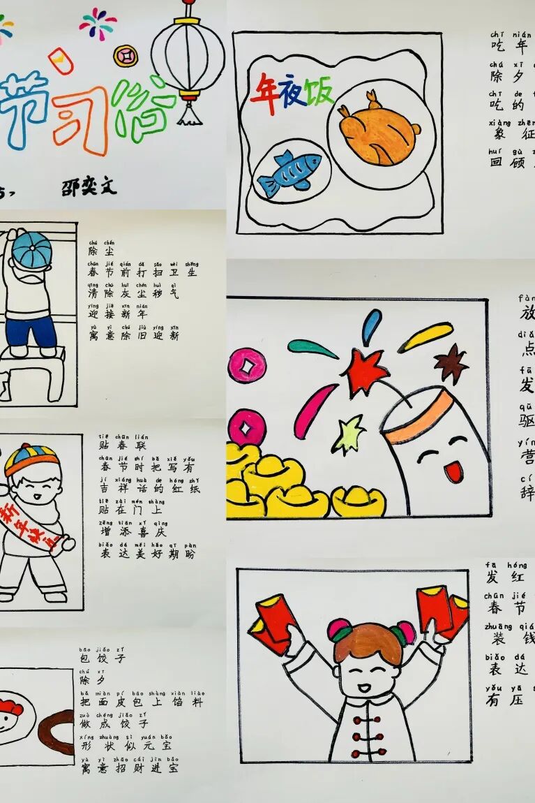 为了迎接新年的到来,中华民族创造了许多习俗。一年级的小朋友选择春节里的一种习俗,用绘画和简短文字的方式,记录了自己的生活。