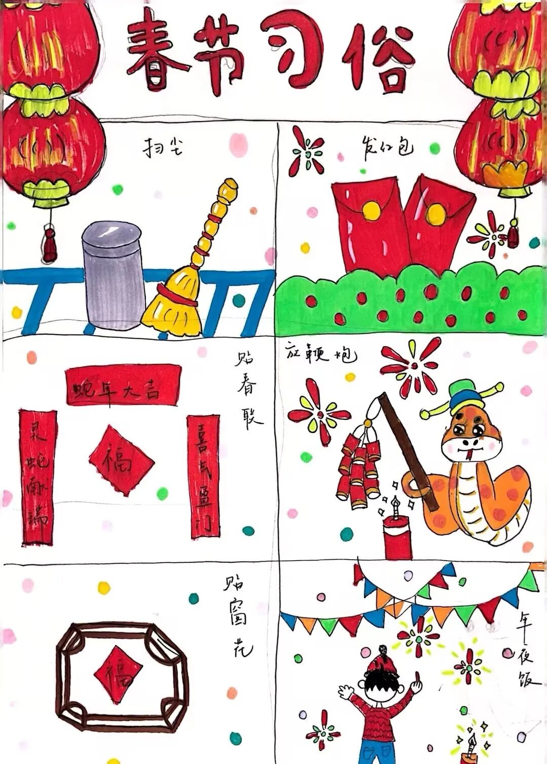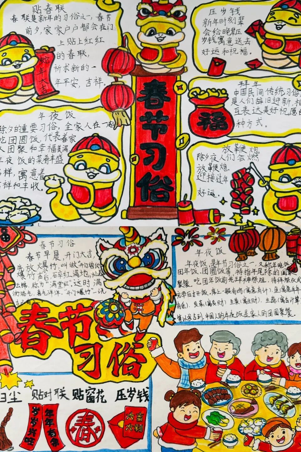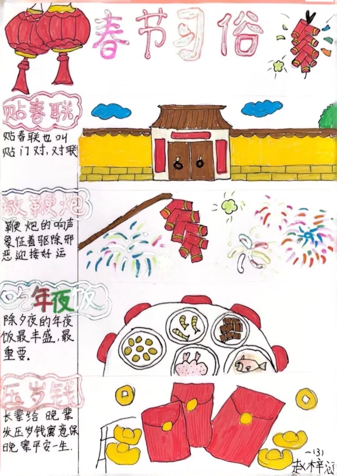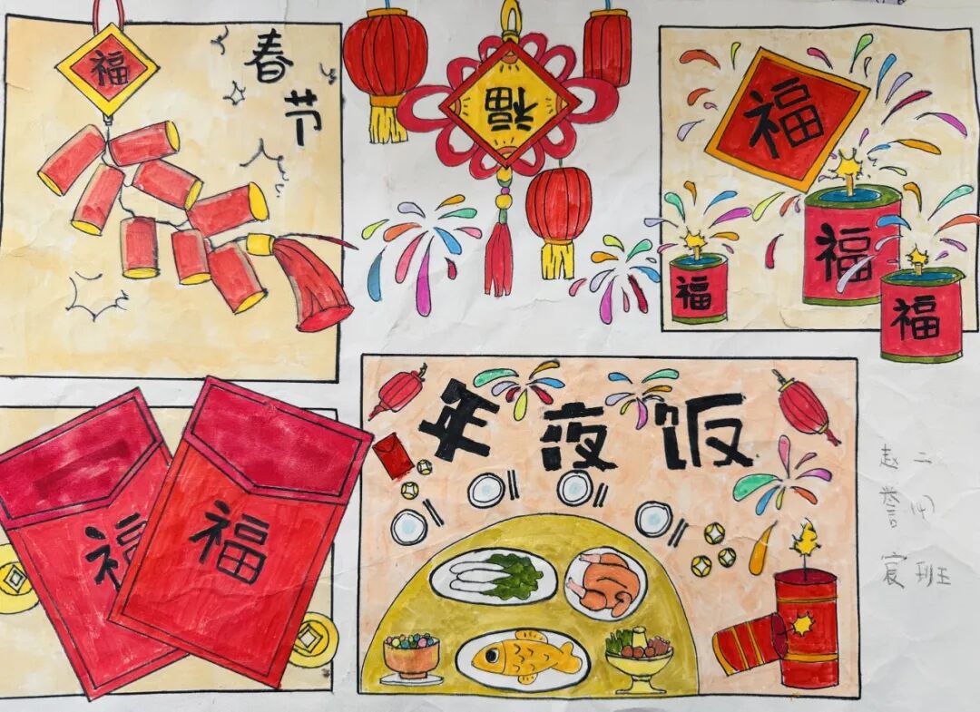 为了迎接新年的到来,中华民族创造了许多习俗。一年级的小朋友选择春节里的一种习俗,用绘画和简短文字的方式,记录了自己的生活。
