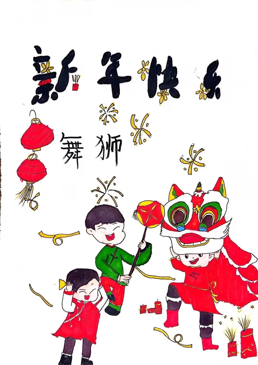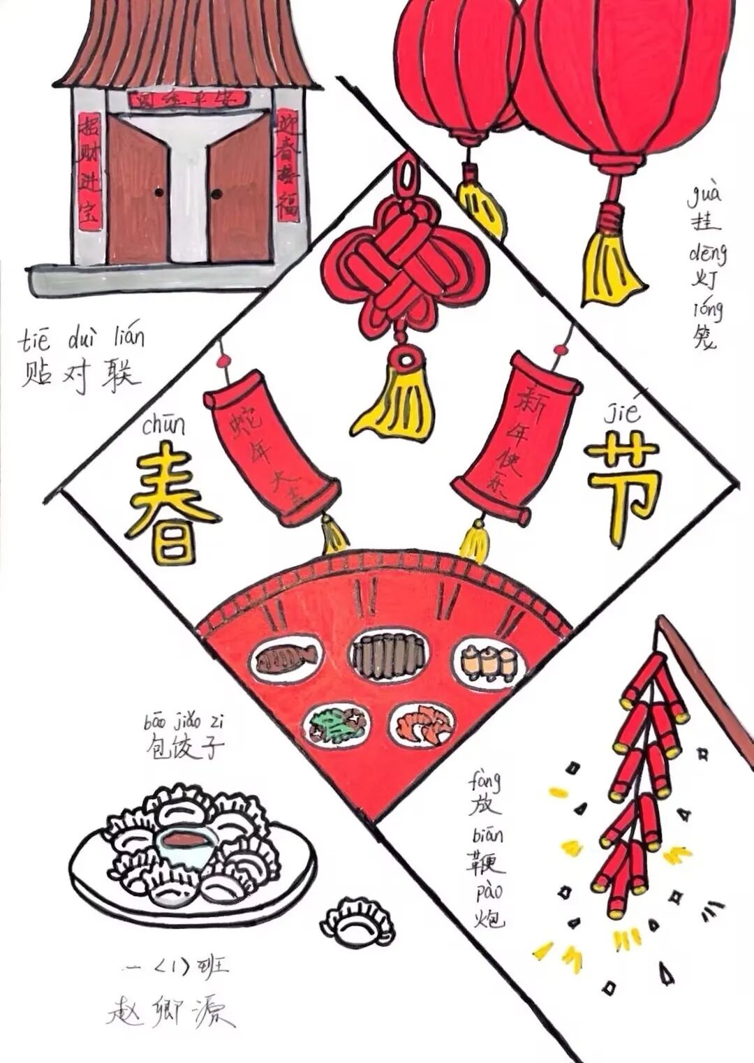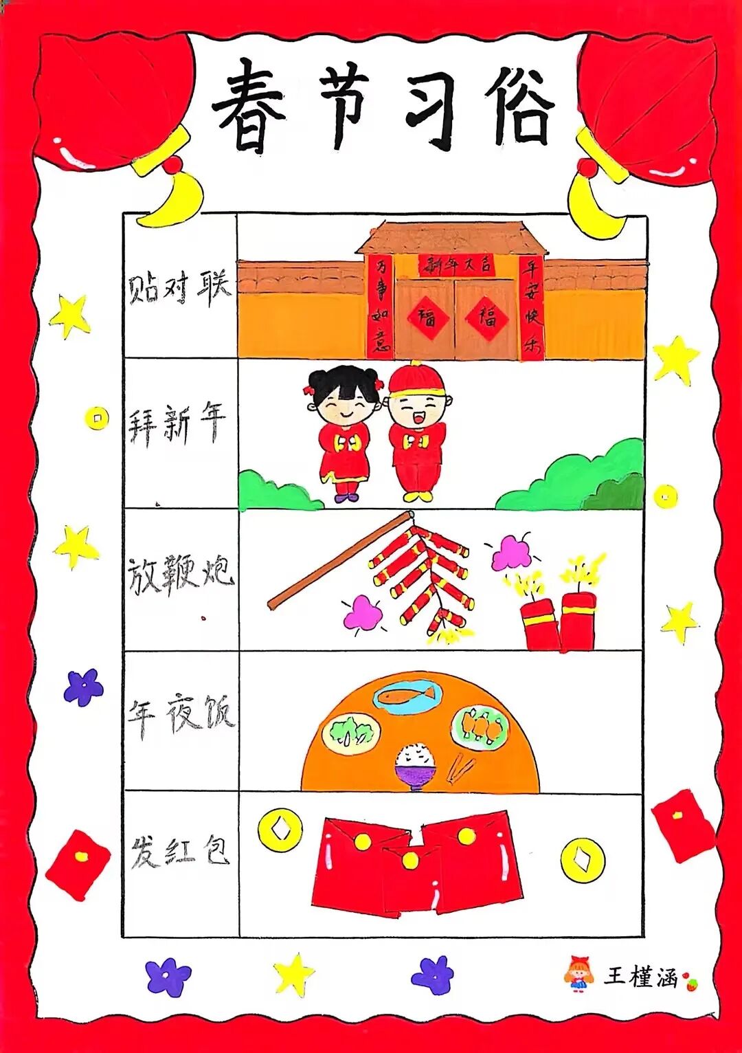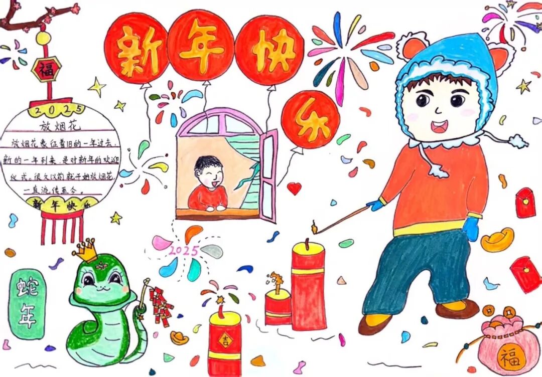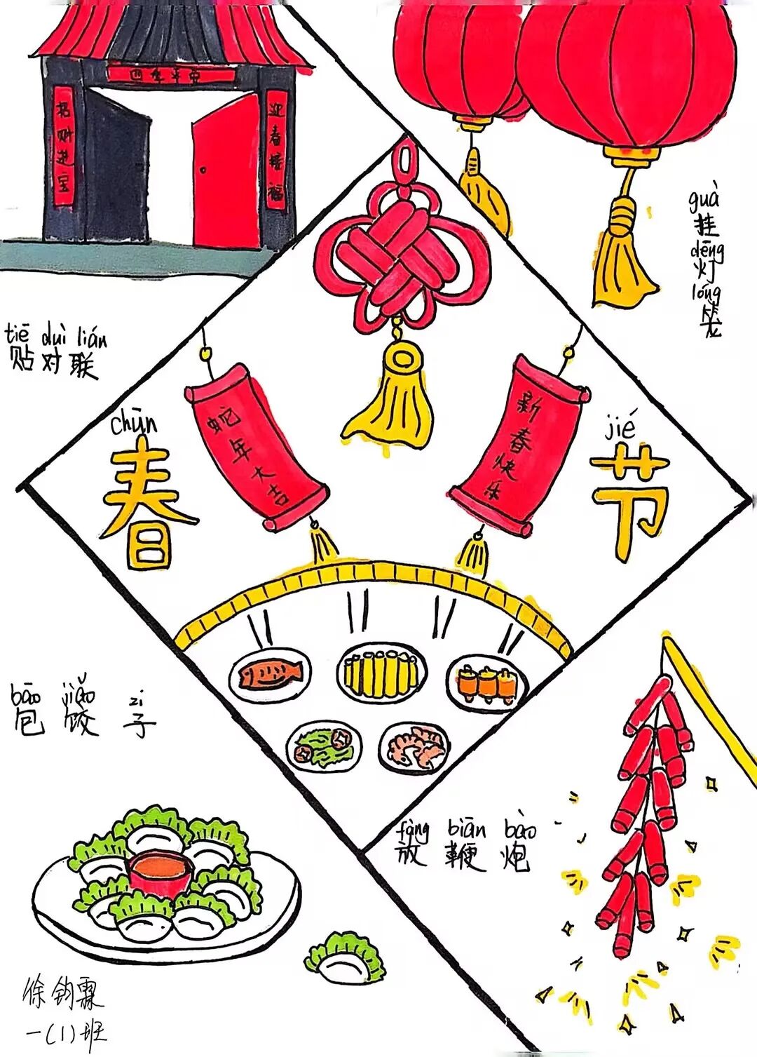 为了迎接新年的到来,中华民族创造了许多习俗。一年级的小朋友选择春节里的一种习俗,用绘画和简短文字的方式,记录了自己的生活。