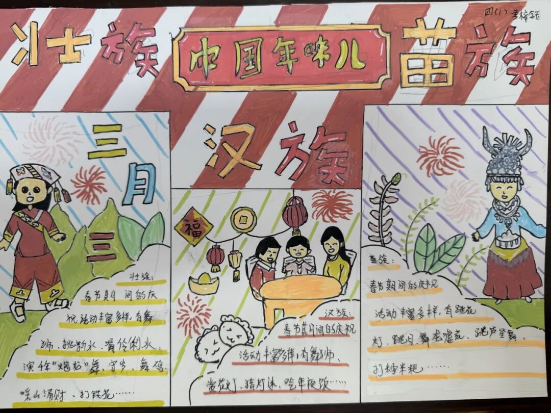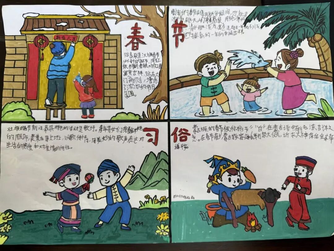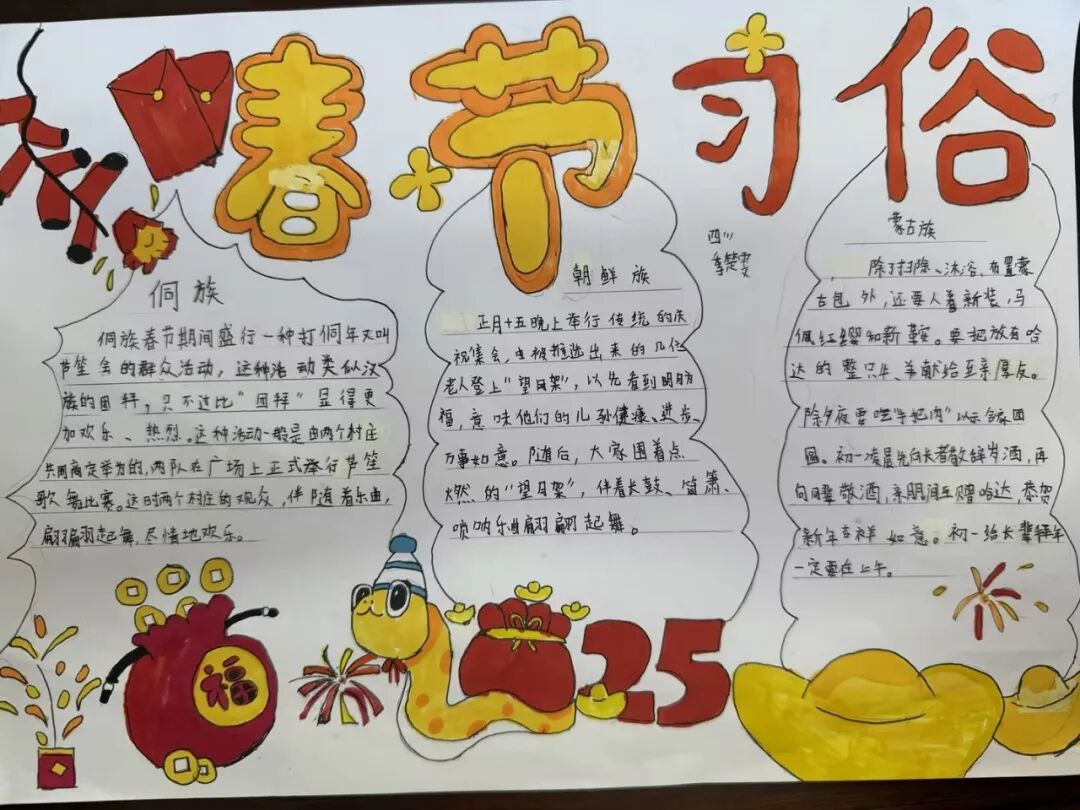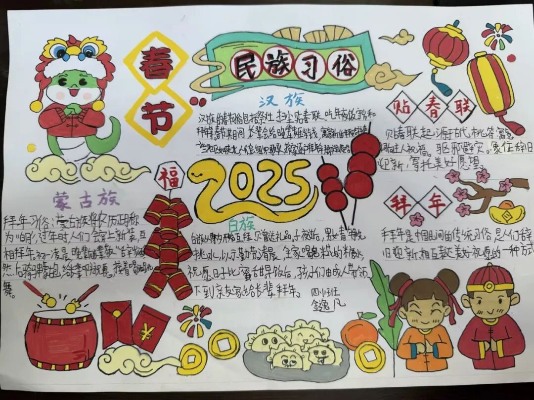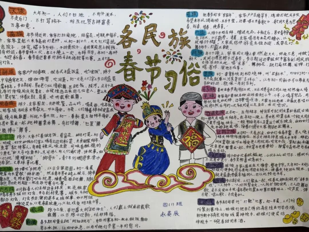 每一个民族都有独属于这个民族特有的春节习俗。四年级的孩子用小报的方式,介绍了春节里最有代表性的、且与众不同的习俗。