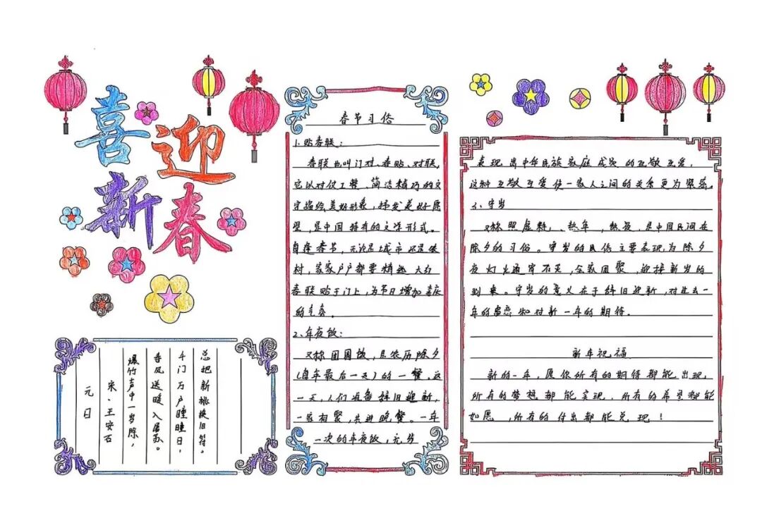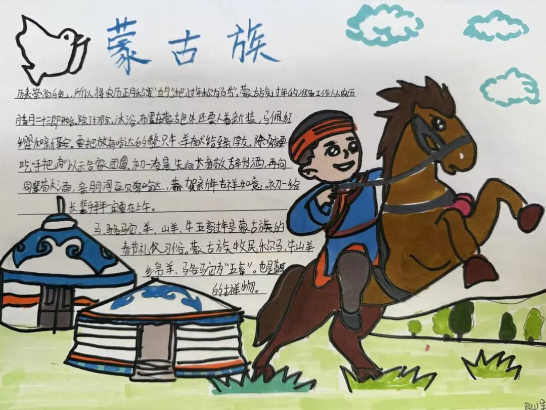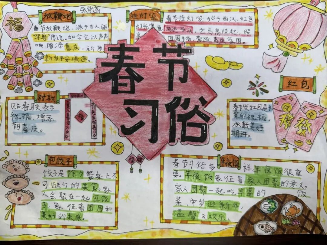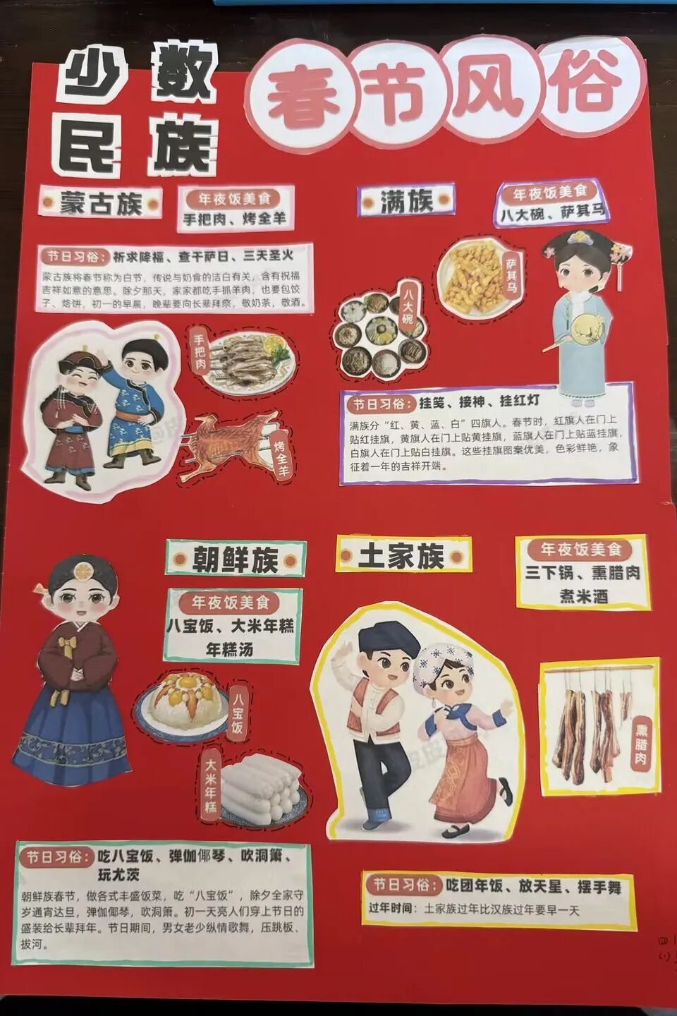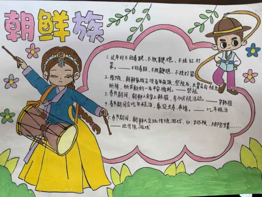 每一个民族都有独属于这个民族特有的春节习俗。四年级的孩子用小报的方式,介绍了春节里最有代表性的、且与众不同的习俗。