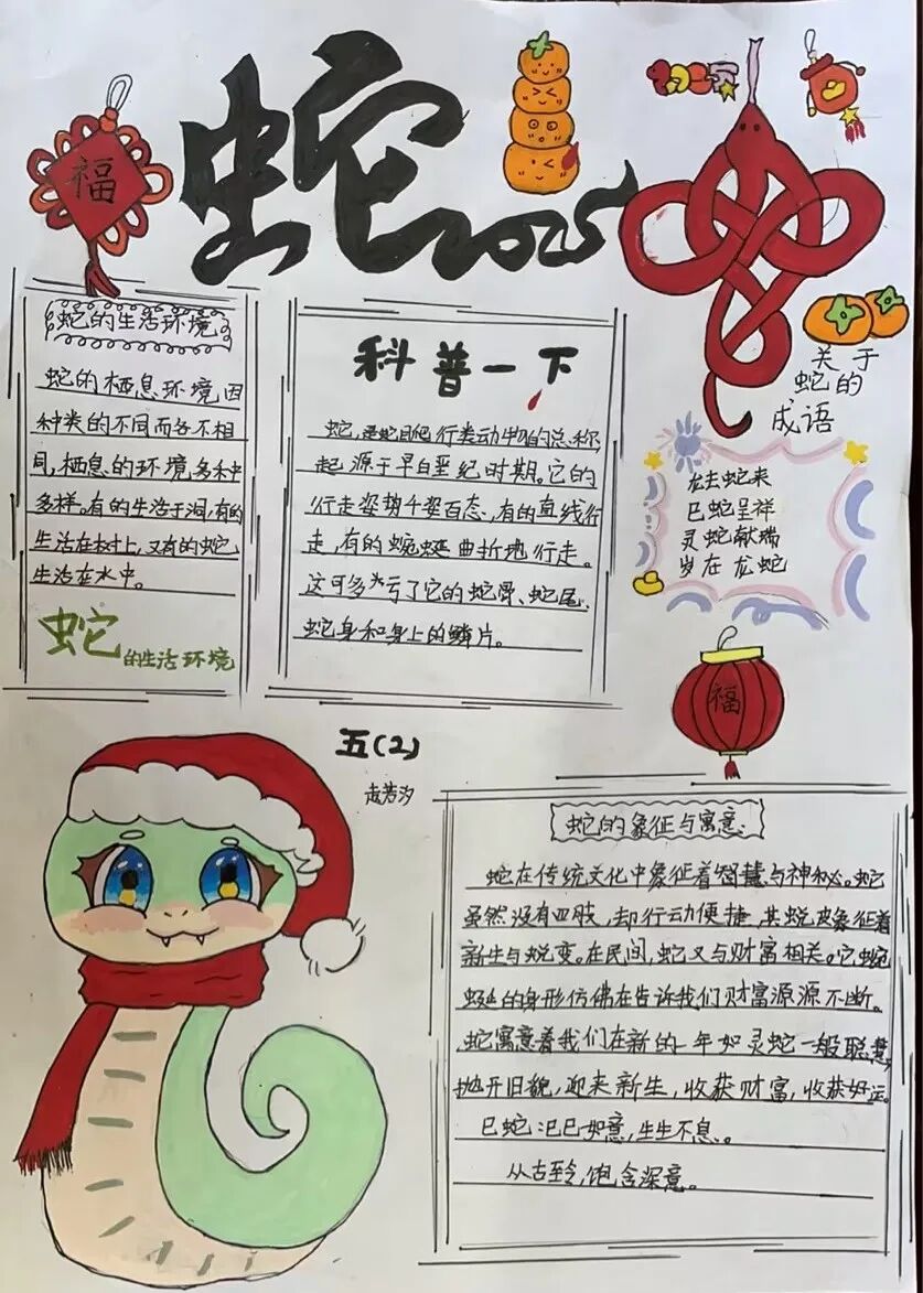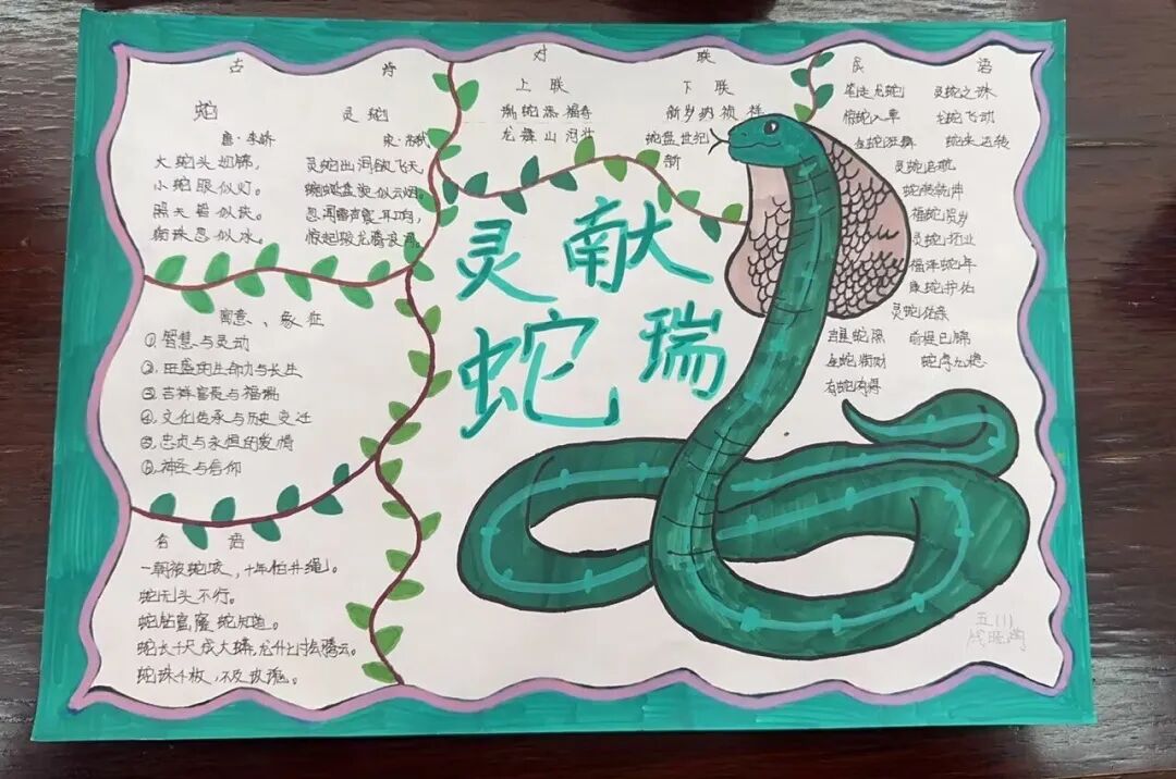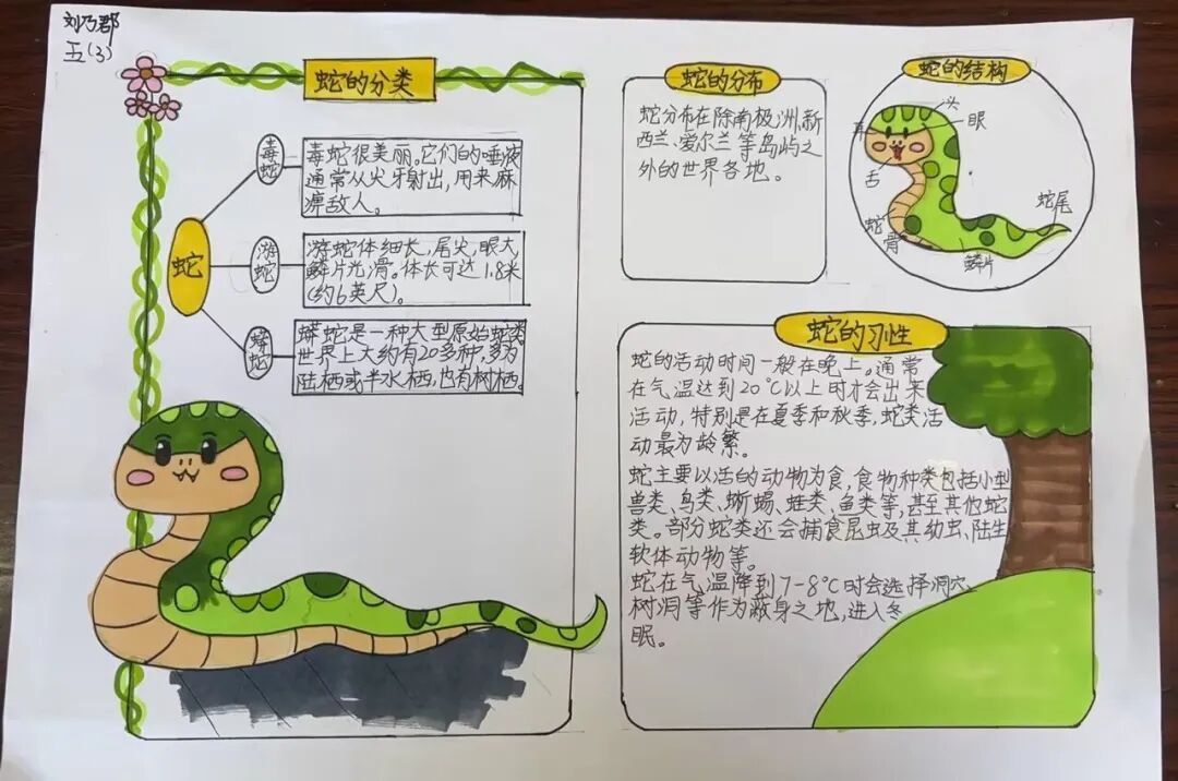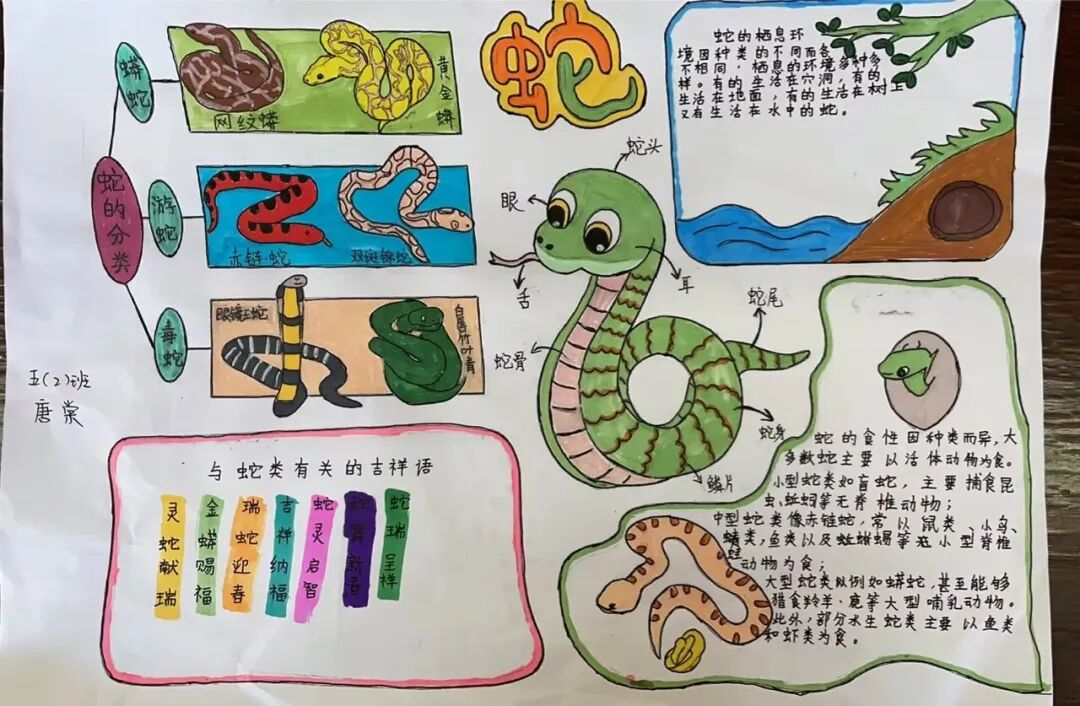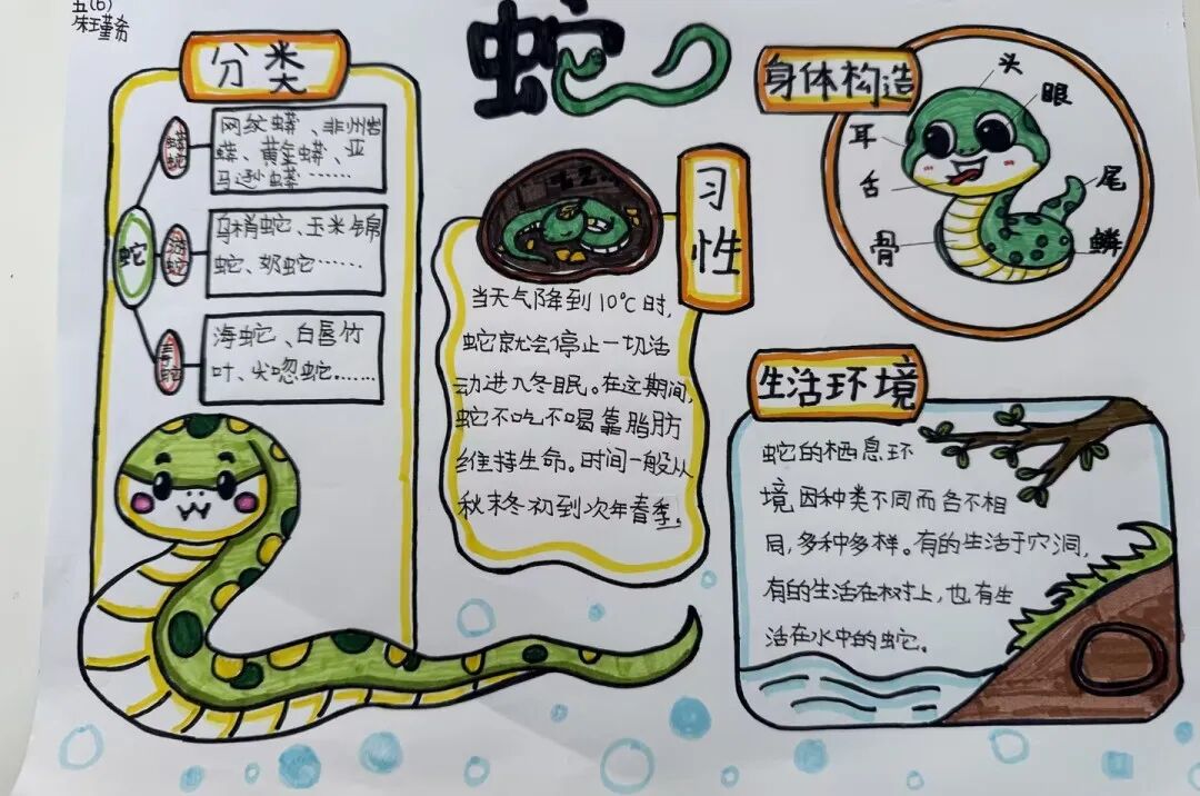 2025年是蛇年,五年级的同学们以“蛇”为研究对象,通过网络,书籍,了解蛇这种动物,用手抄报和思维导图的方式做了精彩的展示。