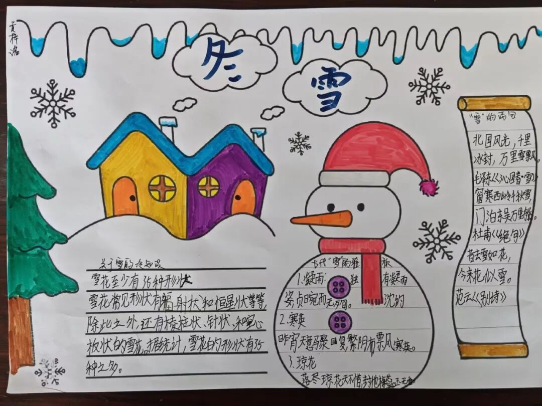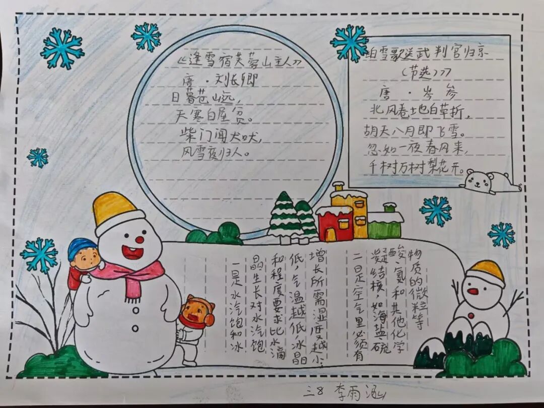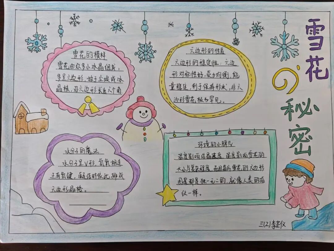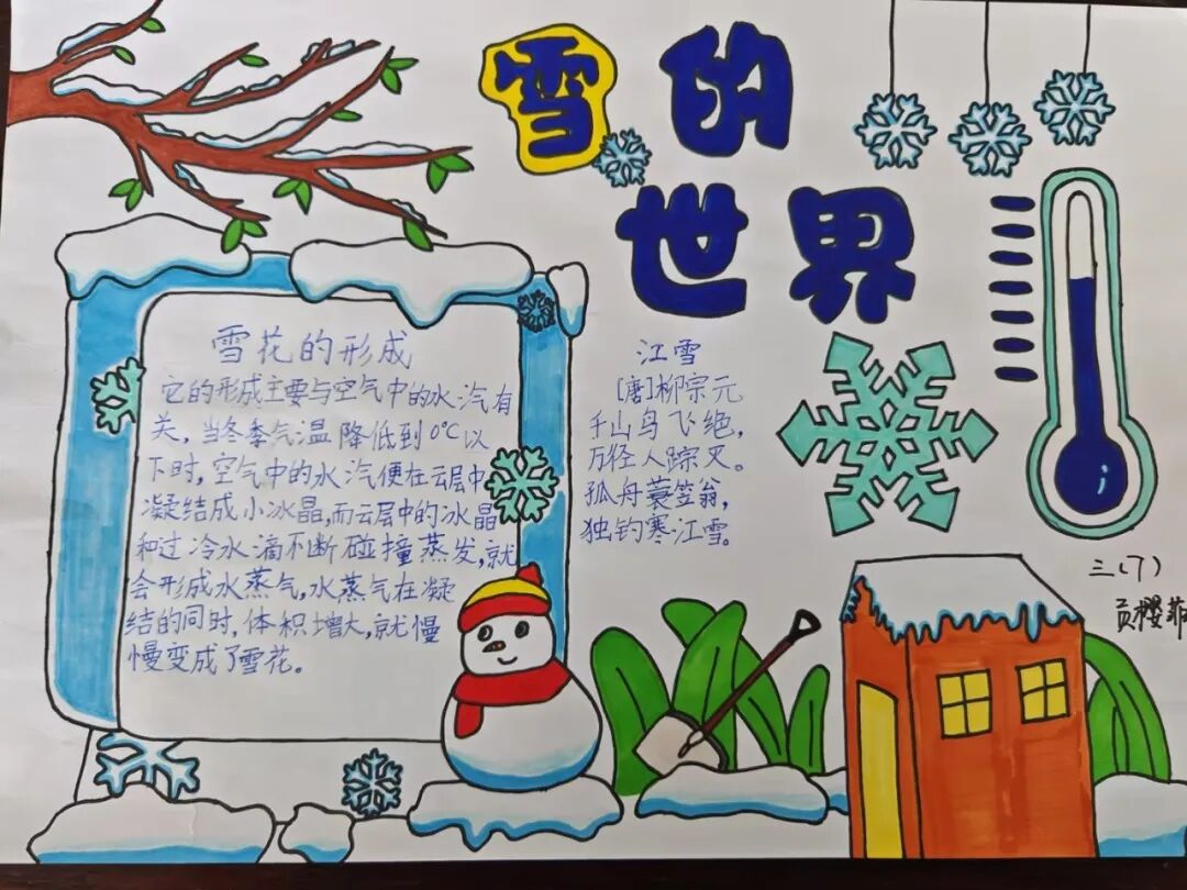 冬天,大雪纷飞。南方甚少下雪,因此人们尤为期盼雪花。三年级的同学以“雪花”为主题,创作一张跨学科的小报。