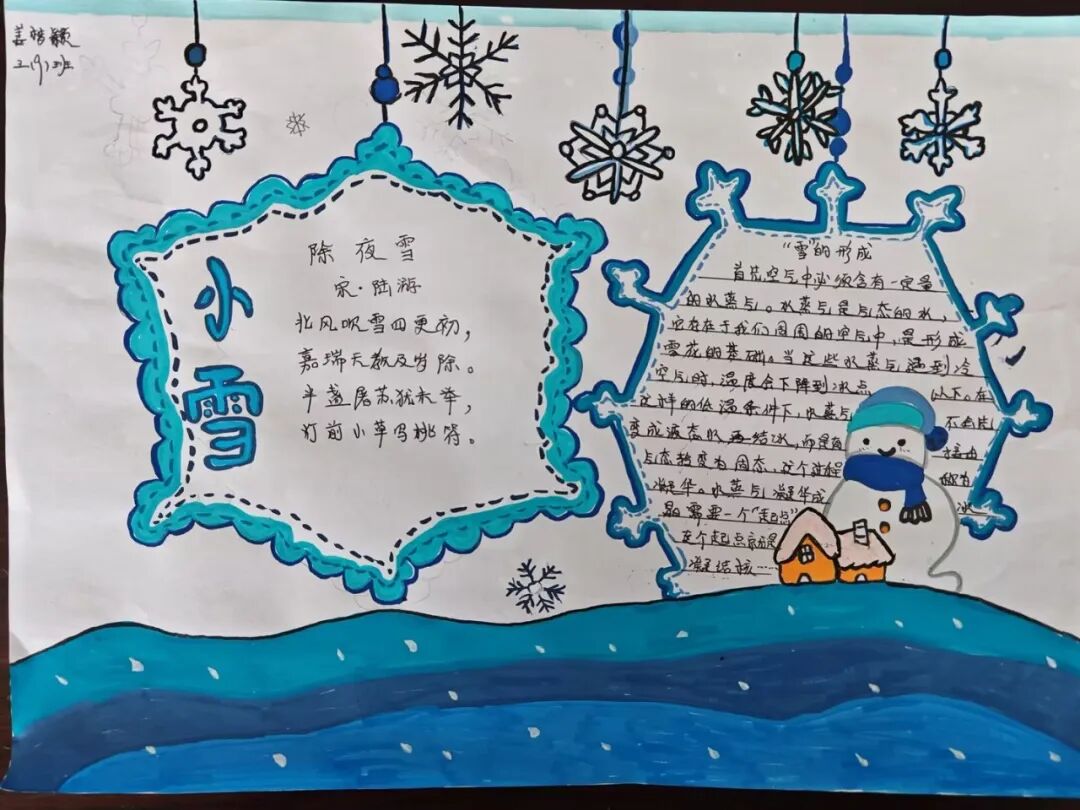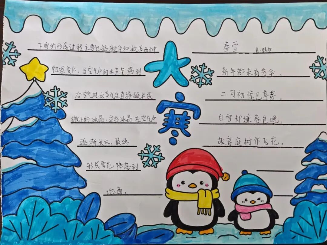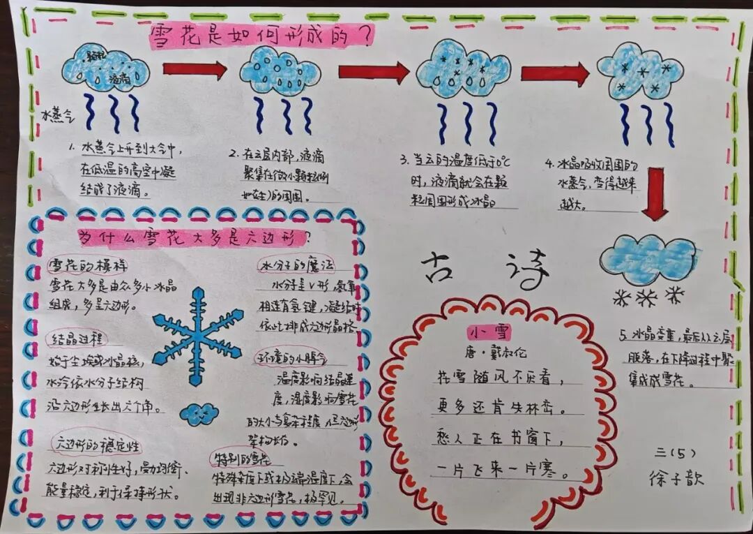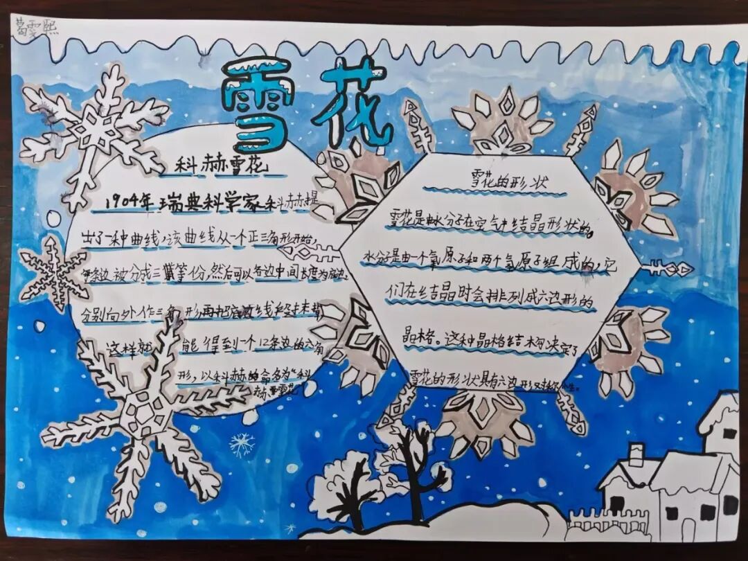 冬天,大雪纷飞。南方甚少下雪,因此人们尤为期盼雪花。三年级的同学以“雪花”为主题,创作一张跨学科的小报。