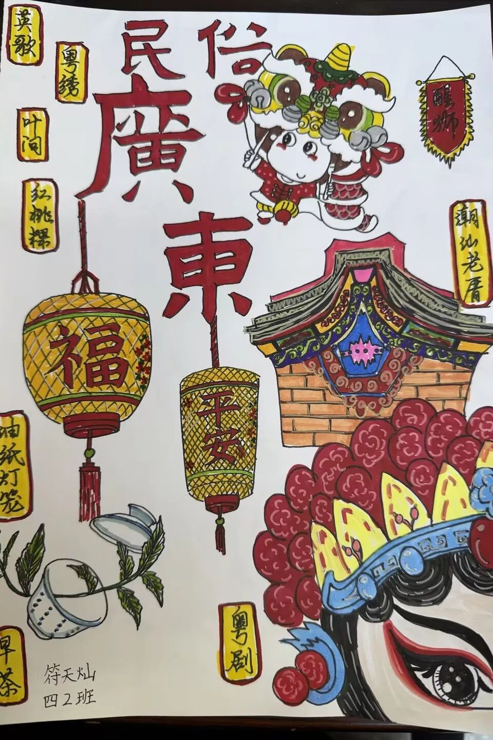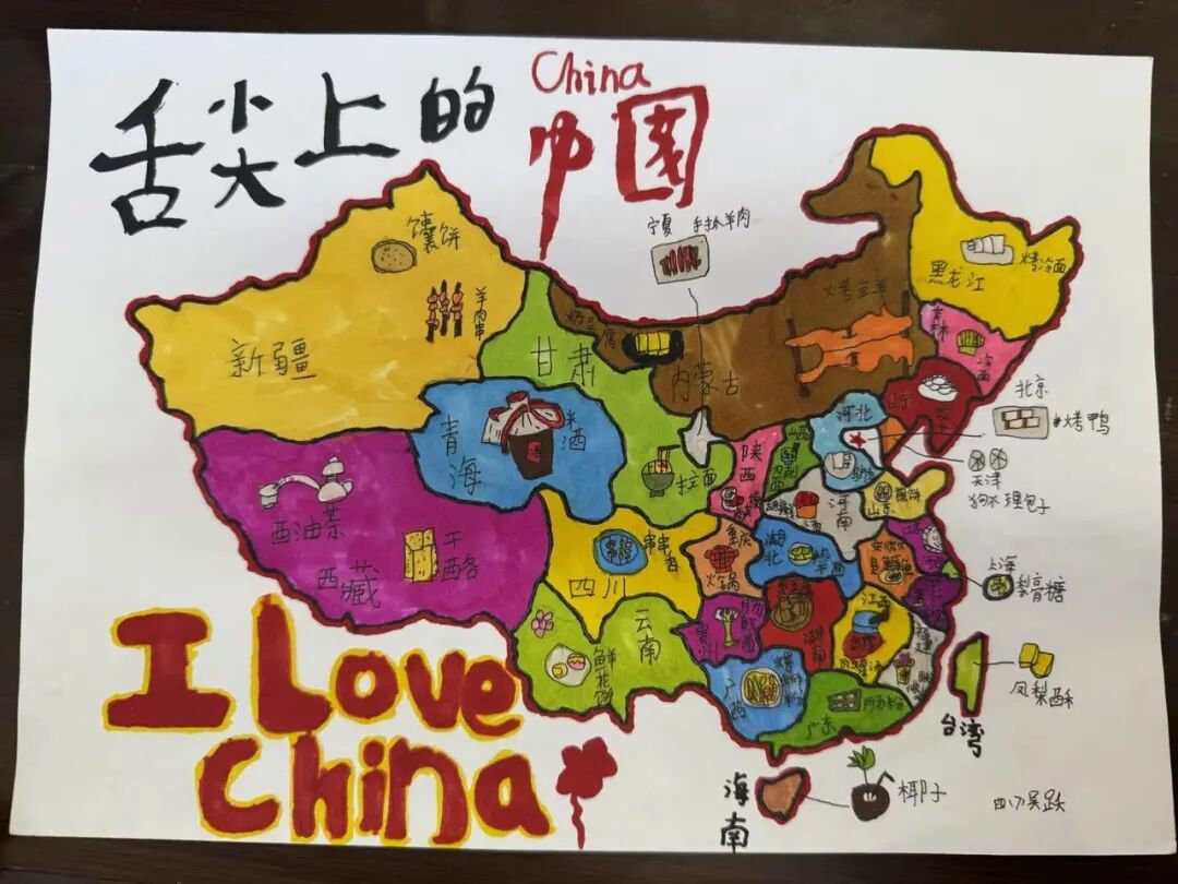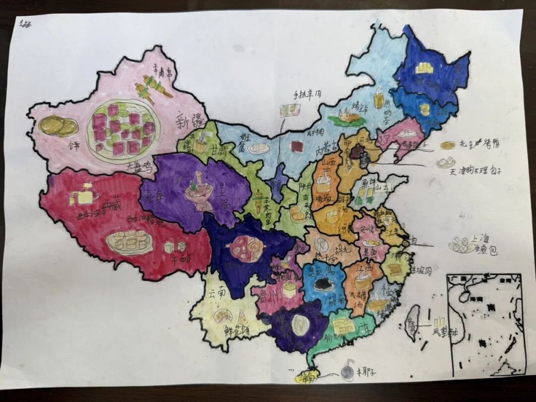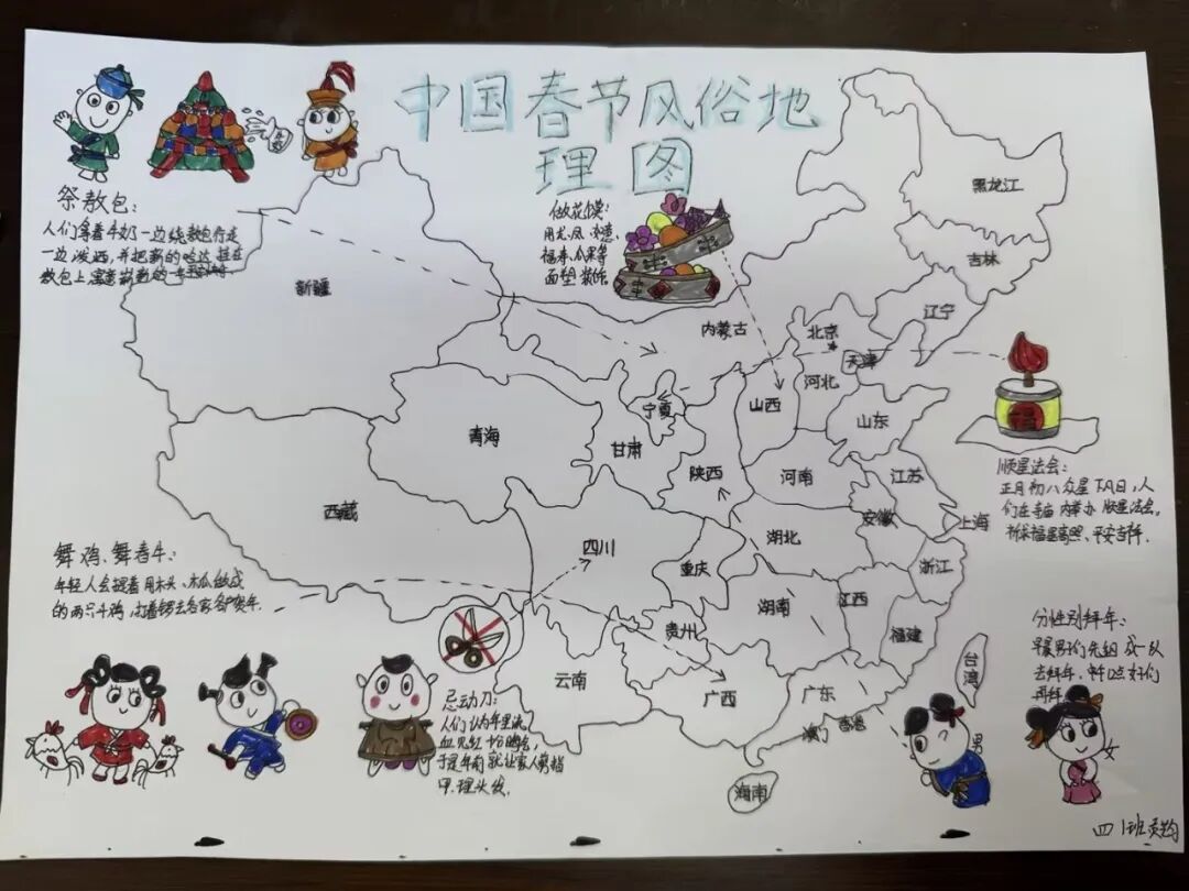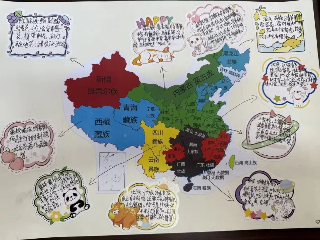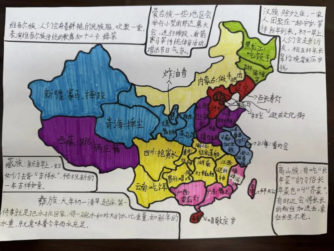 有创意的同学还用文字或绘图的方式,在中国地图上标识民族与春节习俗。