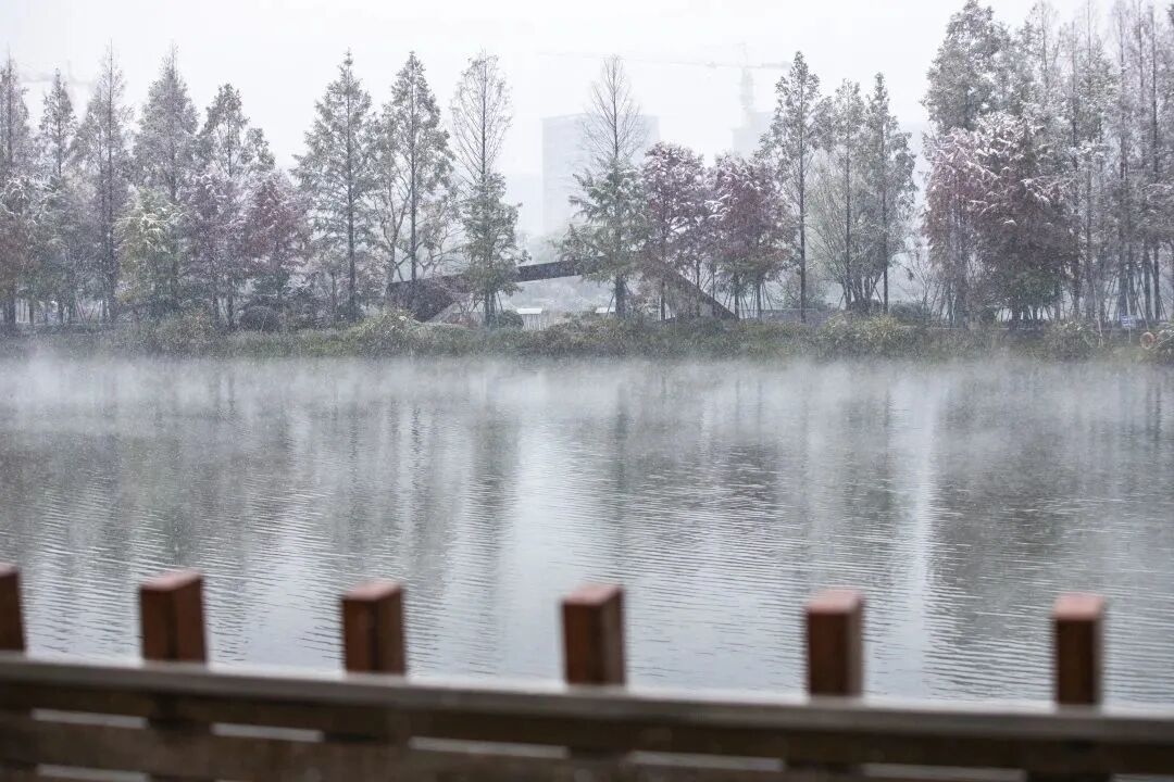 雪花飘落,雾霭沉沉,丰收湖尽显朦胧之美