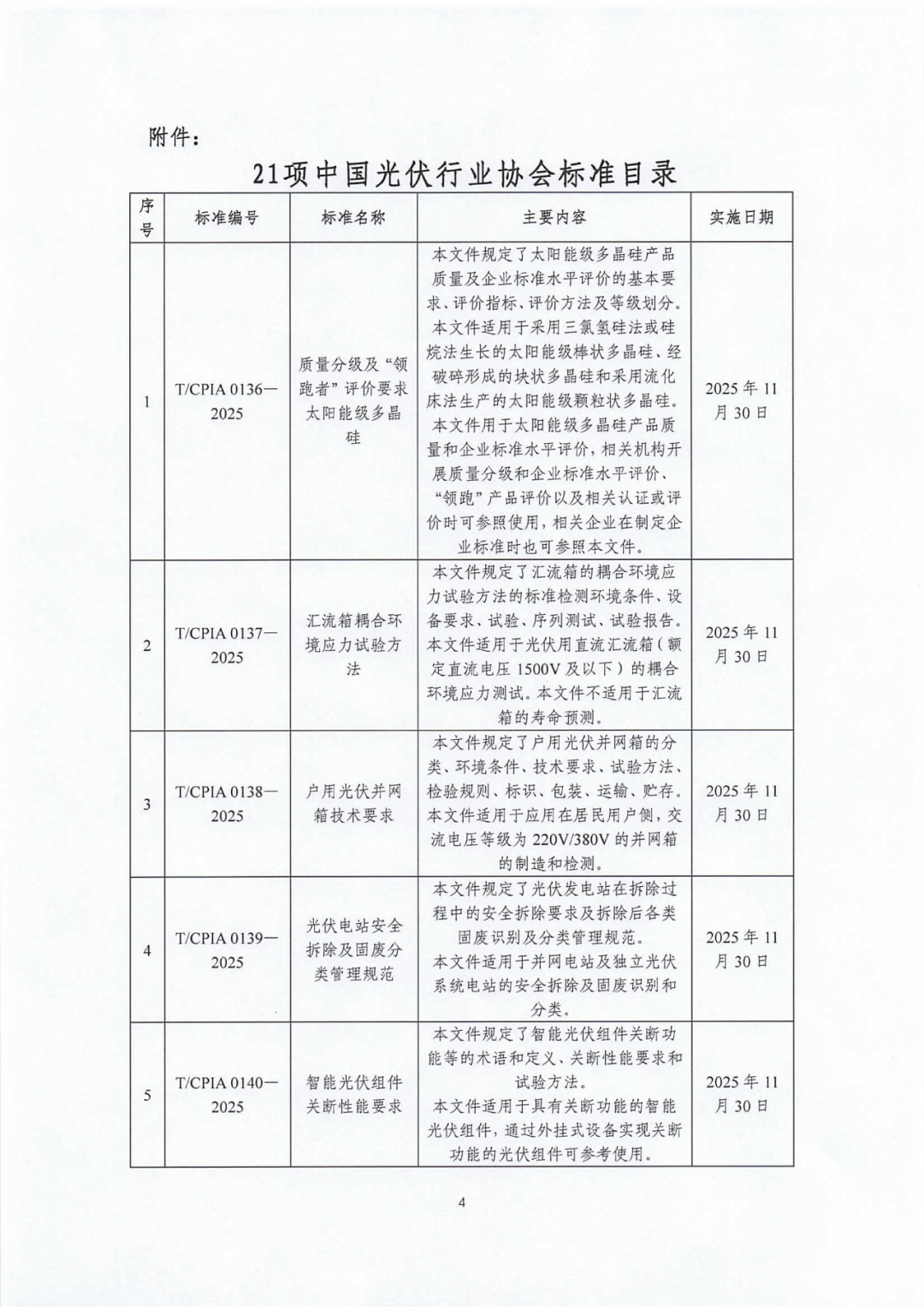 中国光伏行业协会批准发布21项中国光伏行业协会标准,其标准编号和标准名称如下: