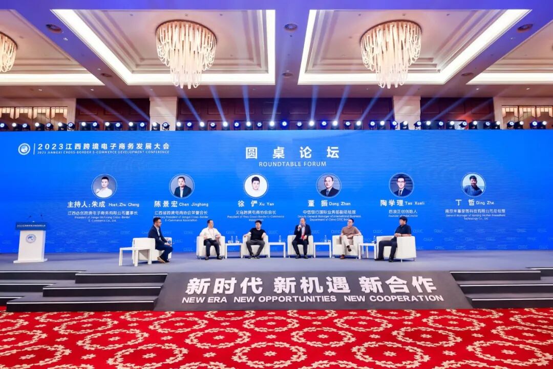 大会第三阶段的圆桌论坛由江西必创跨境电子商务有限公司董事长朱成主持,江西省跨境电商协会荣誉会长陈景宏、义乌跨境电商协会会长徐俨、中信集团国际业务部副总经理董振、后浪正创创始人陶学理、南京禾蓁家居科技有限公司丁哲分别围绕当前跨境电商发展的趋势和江西跨境电商行业遇到的的挑战与机遇作了分享,为进一步推动跨境电商发展建言献智。