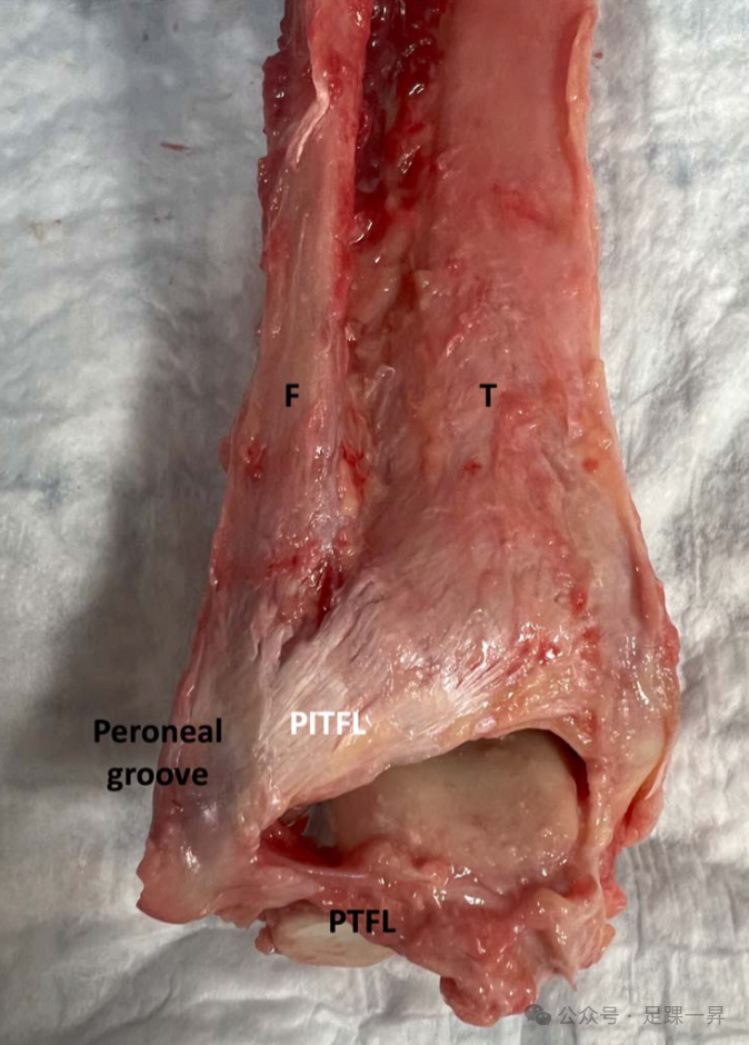 图 1. 本图显示下胫腓后韧带(PITFL)附着于胫骨后外侧结节的远外侧缘。F 代表腓骨;PITFL 为下胫腓后韧带;PTFL 为距腓后韧带;T 为胫骨。