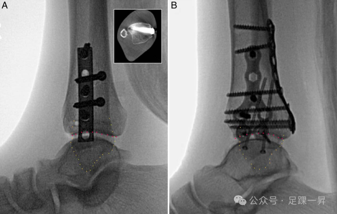 图3. 术中侧位X线片可通过评估腓骨与胫骨的相对位置帮助识别下胫腓联合复位不良。A. 复位不良患者的术中侧位透视图像(如白色方框内的术后轴向CT图像所示)显示,与对侧未受伤侧的前端相比,腓骨相对前移(黄色圆点标记)。通过与未受伤对侧进行双侧对比,可能有助于评估复位的充分性。CT所示为胫骨远端关节面(红色圆点标记)。这与解剖复位患者的图像(如图B所示)不同。