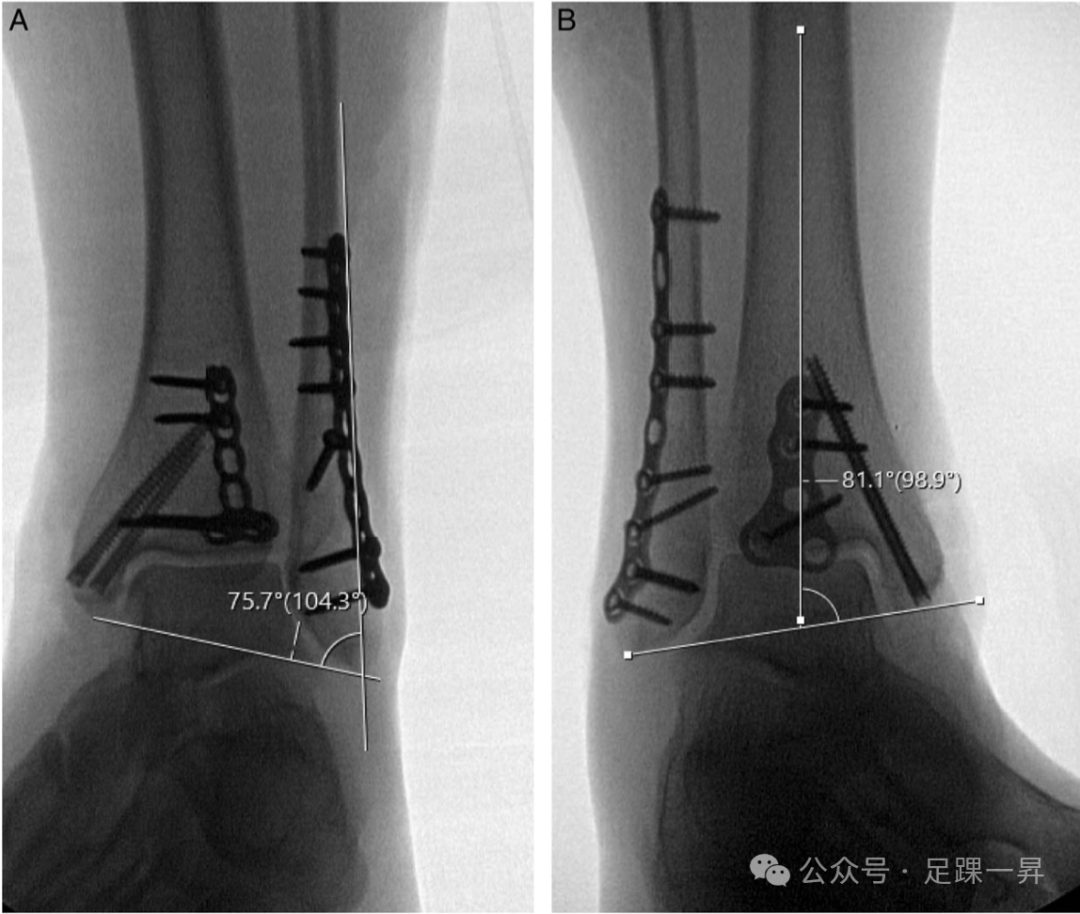 图2. A. 双踝角(正常范围:72至86度)由平行于腓骨的直线与踝间线之间的夹角定义。B. 胫距角(正常范围:75至86度)由垂直于胫骨远端关节面的直线与踝间线的交点形成。