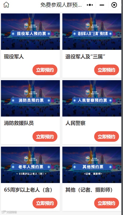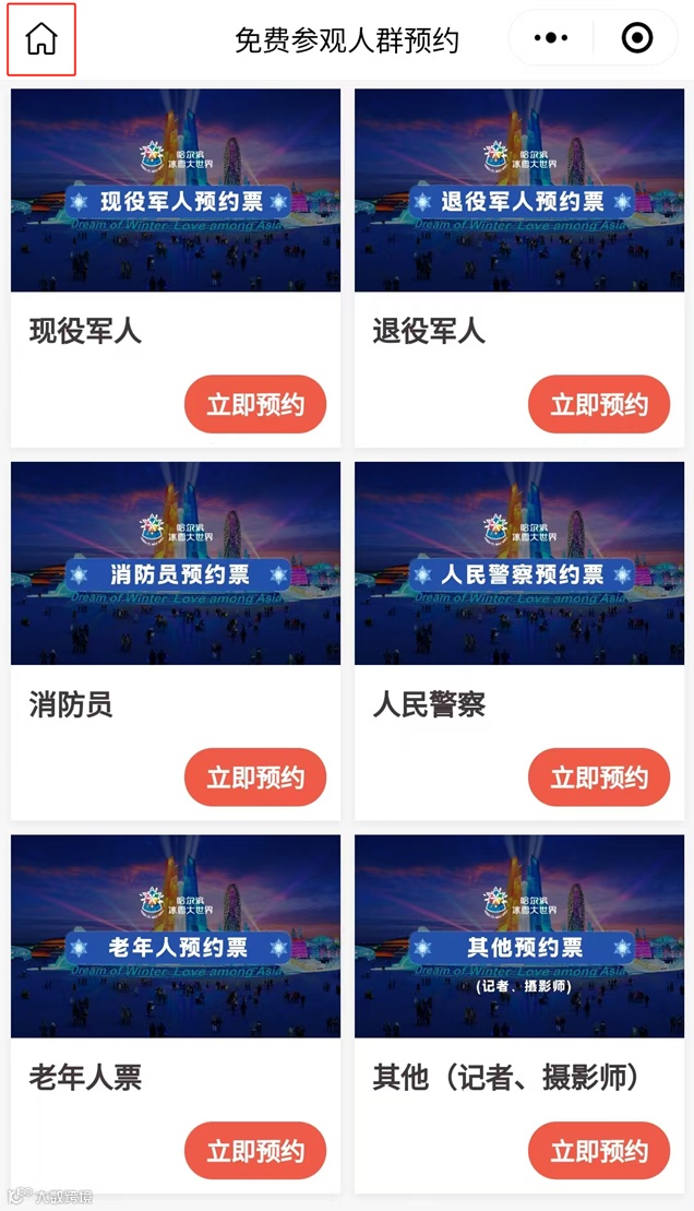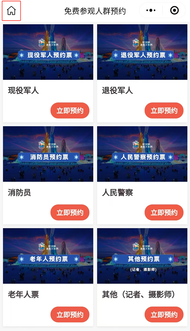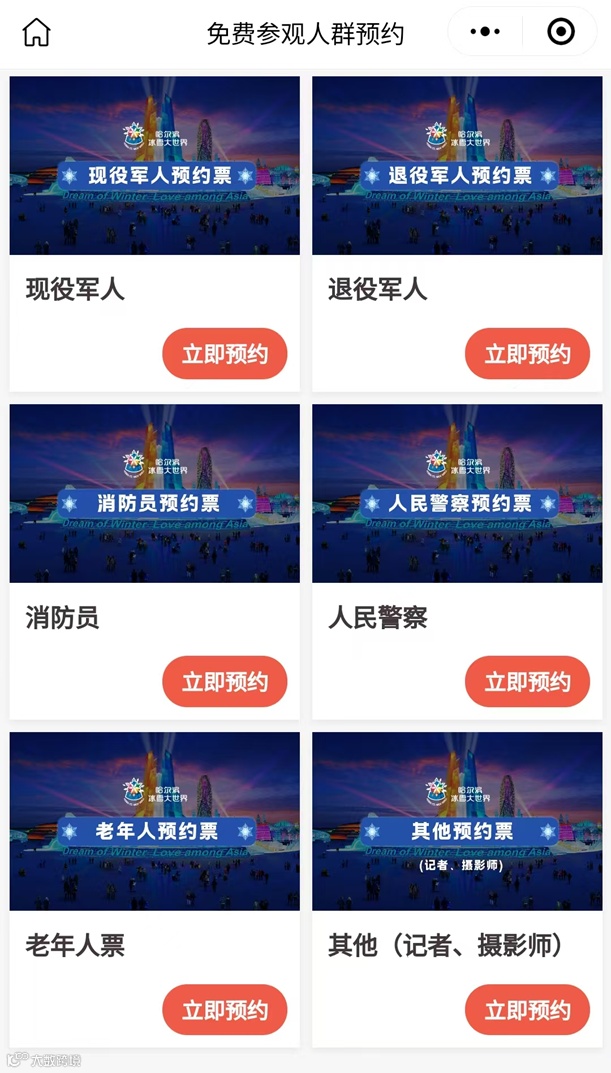 进入“哈尔滨冰雪大世界”官方微信公众号,点击“购票预约”,选择“免费预约”;