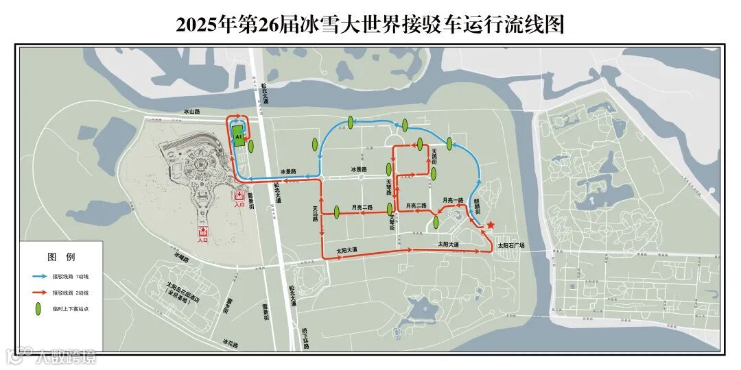 2、转运路线:各接驳点——冰景路地下通道——冰花路——雪景街——A1停车场,路线循环往返。